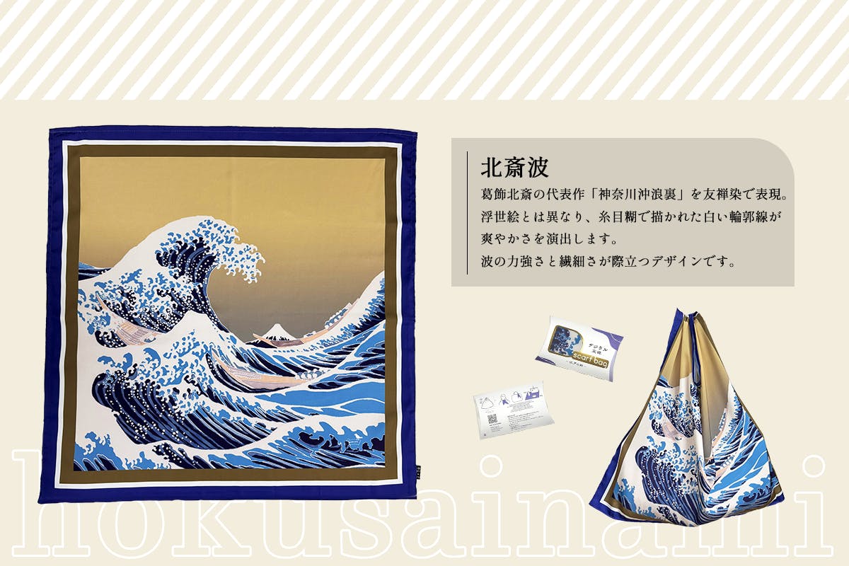葛飾北斎の代表作「神奈川沖浪裏」を友禅染で表現。 浮世絵とは異なり、糸目糊で描かれた白い輪郭線が爽やかさを演出します。 波の力強さと繊細さが際立つデザインです。