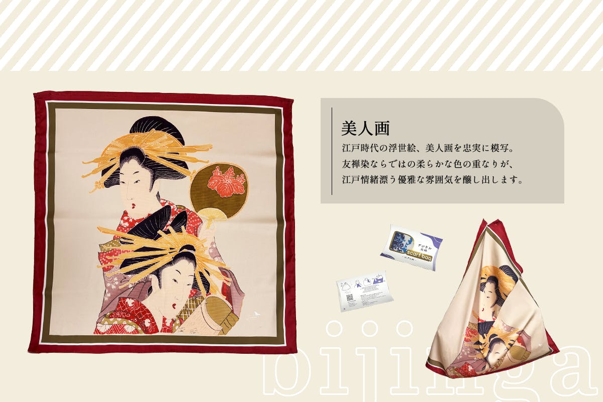 江戸時代の浮世絵、美人画を忠実に模写。 友禅染ならではの柔らかな色の重なりが、江戸情緒漂う優雅な雰囲気を醸し出します。