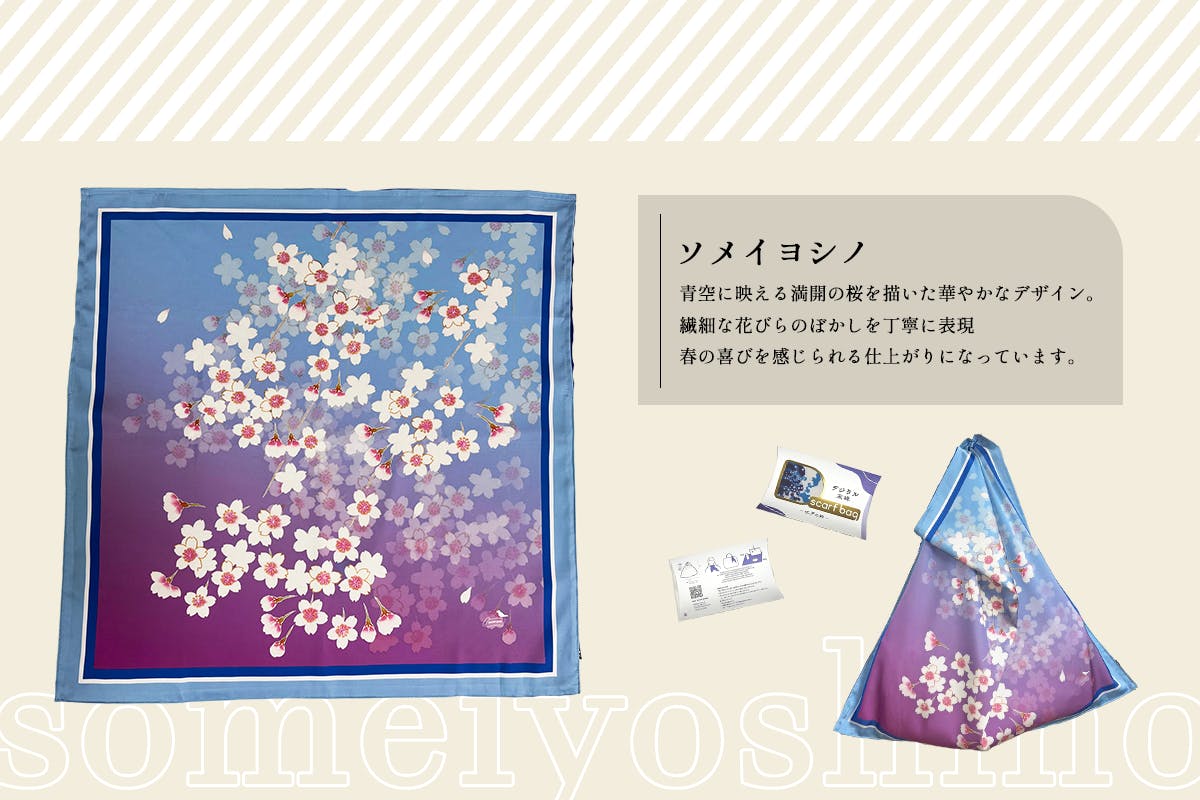 今回新たに3種類のデザインを作成。55cm×55cmサイズで、エコバッグとしてもスカーフとしても使える便利なアイテムです。