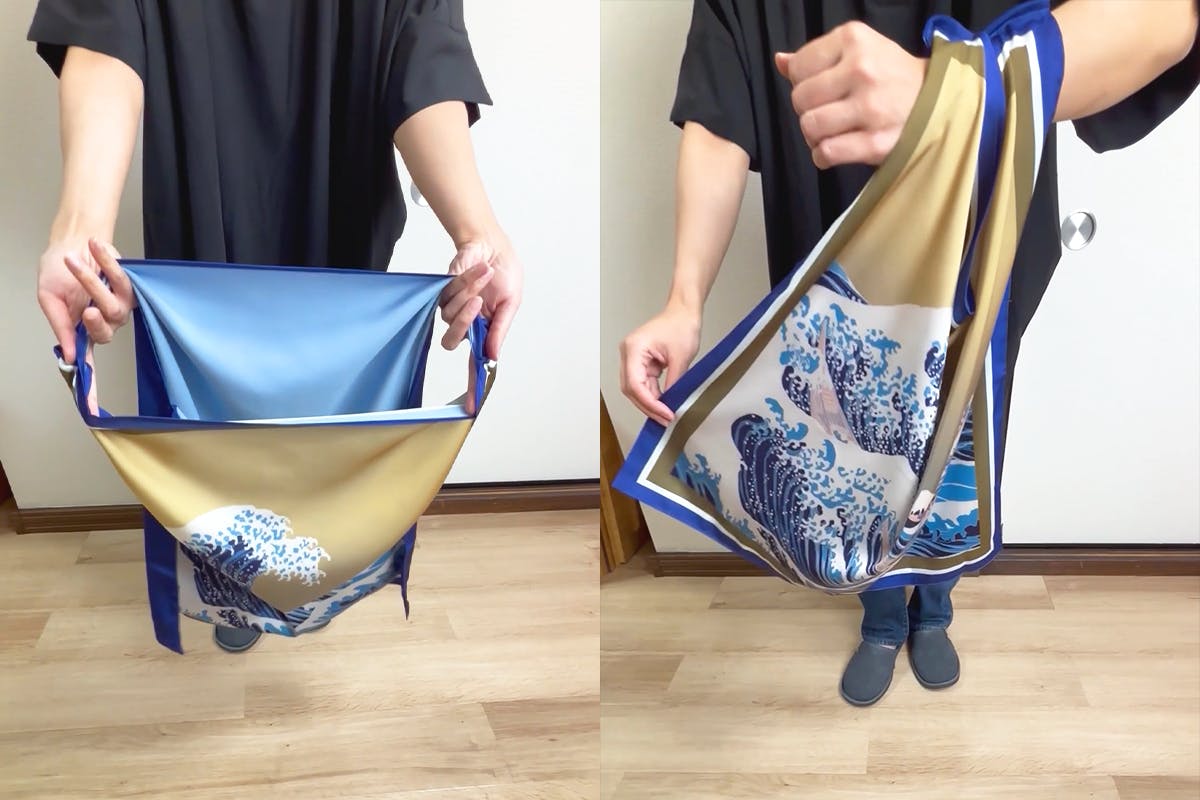 今回のプロジェクトで製作した「スカーフバッグ」は、スカーフとしての上品さとエコバッグとしての実用性を兼ね備えた商品です。日常の買い物やお出かけに便利なだけでなく、友禅の美しさも感じていただけます。