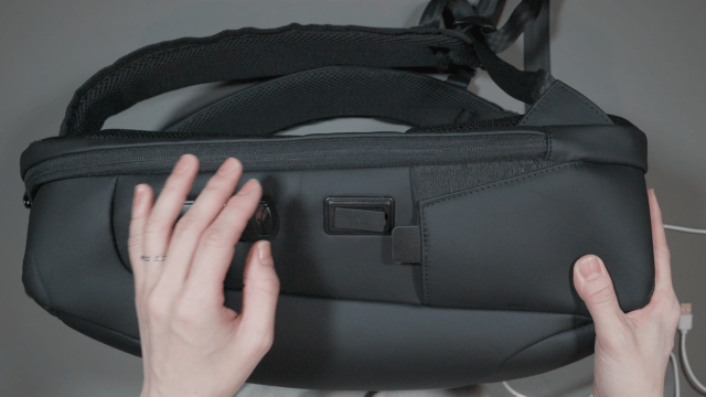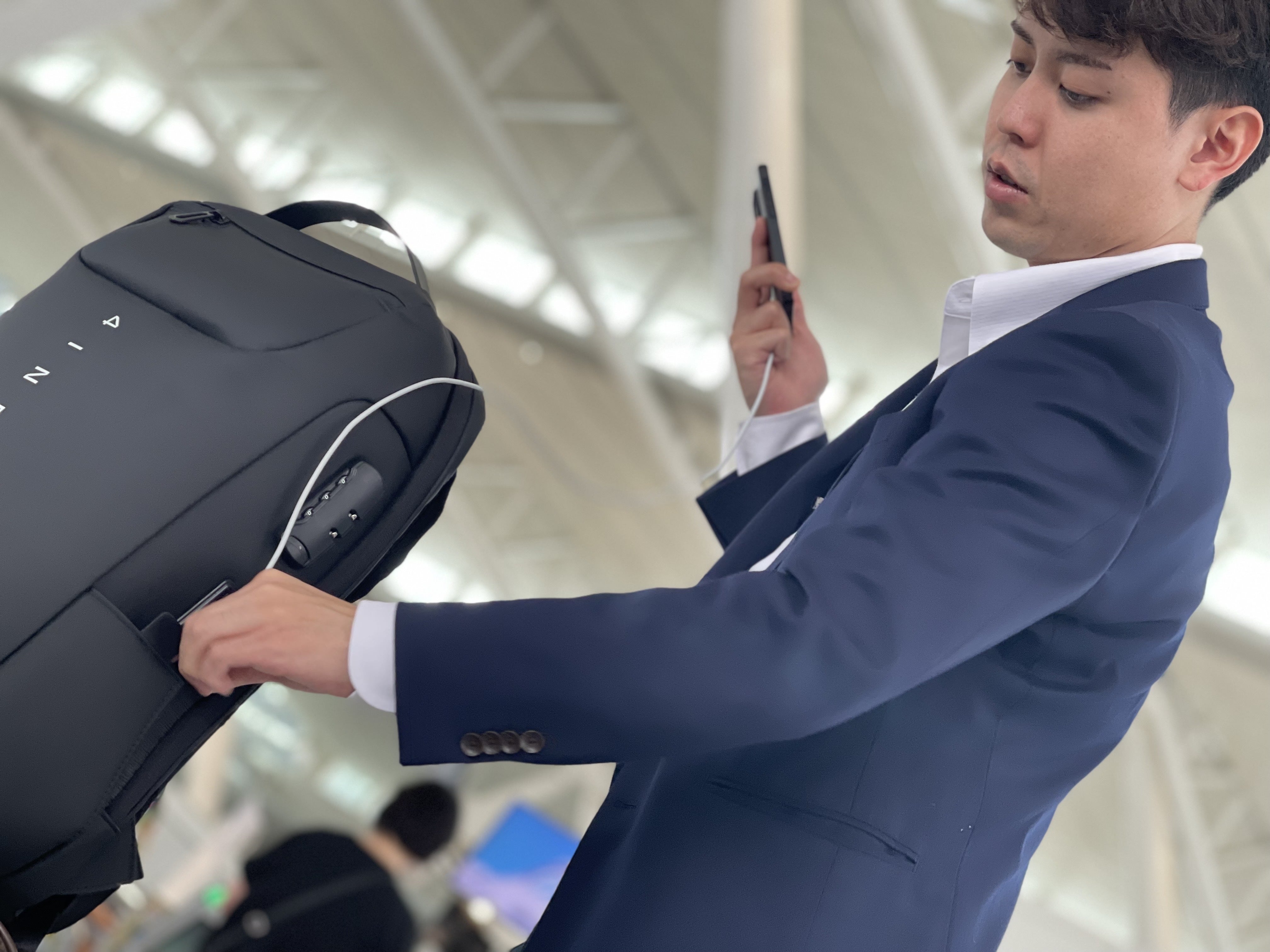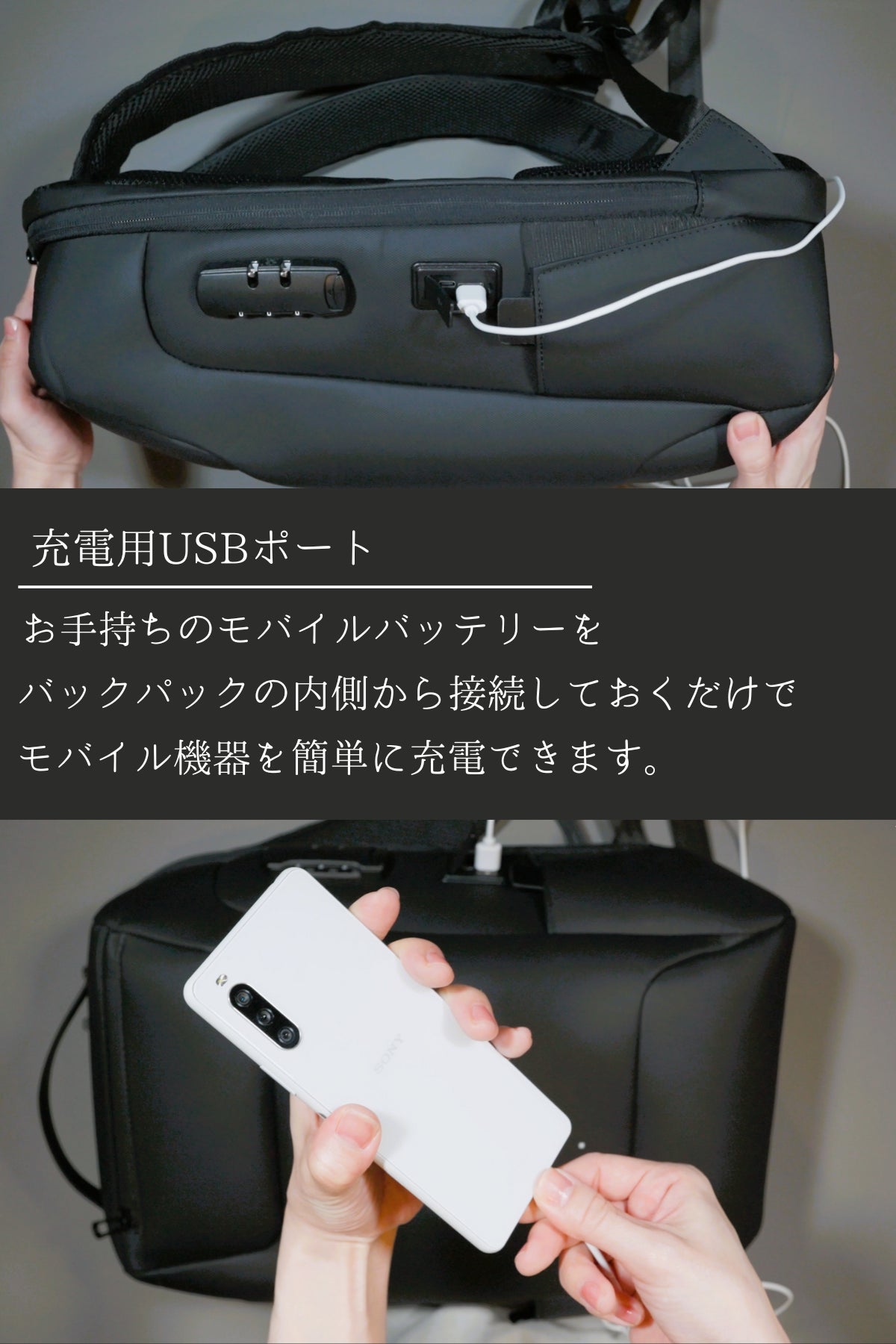 バックパックから取り出すことなくモバイル機器を充電できます!