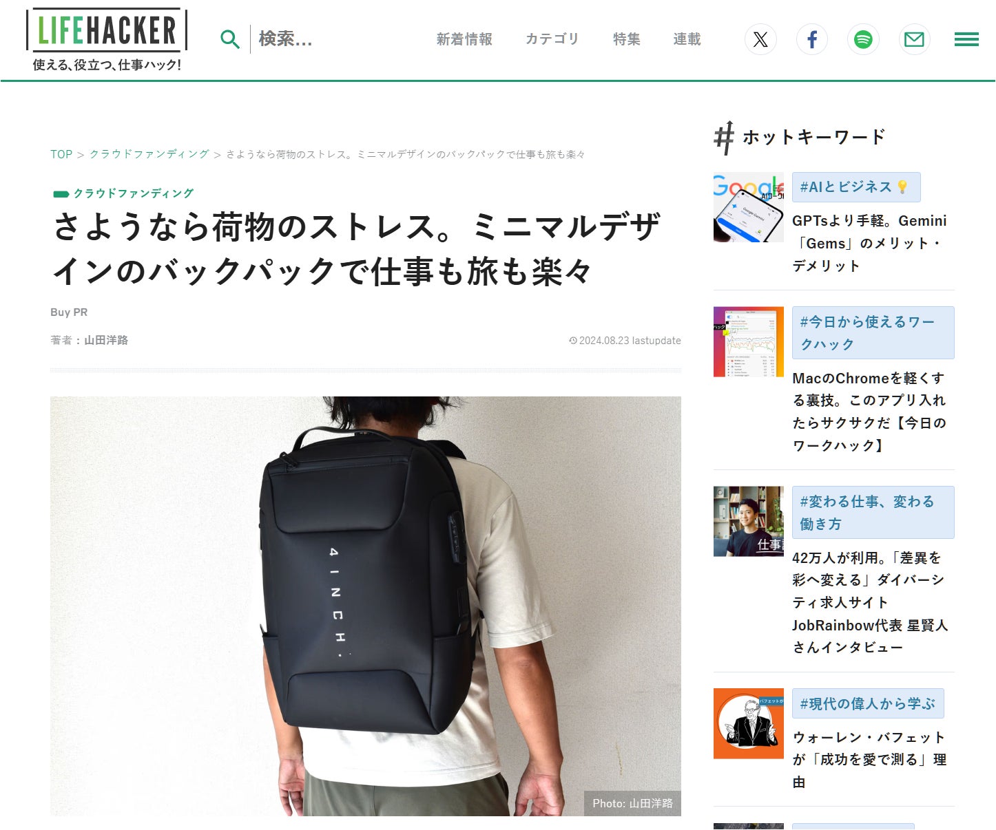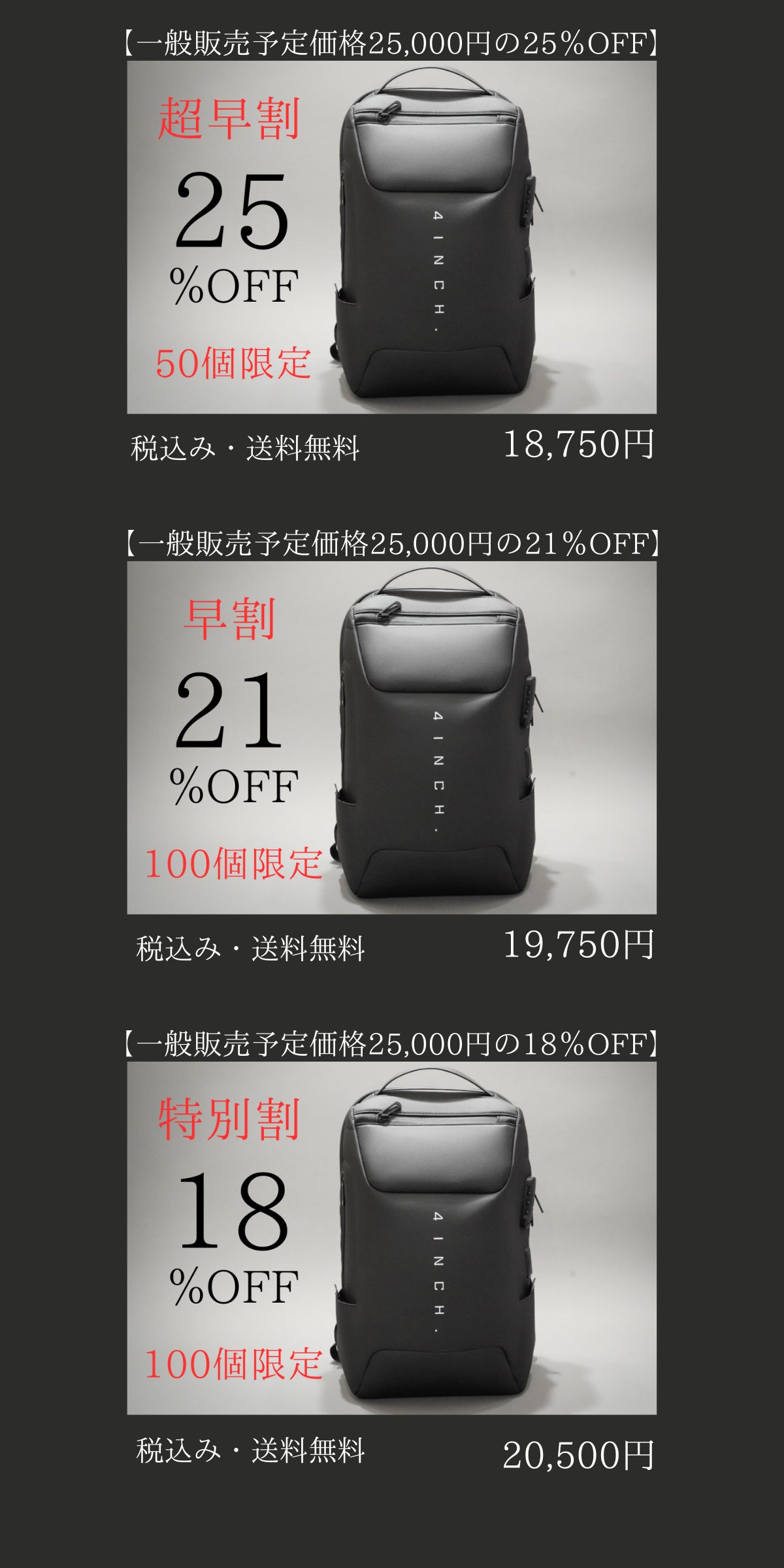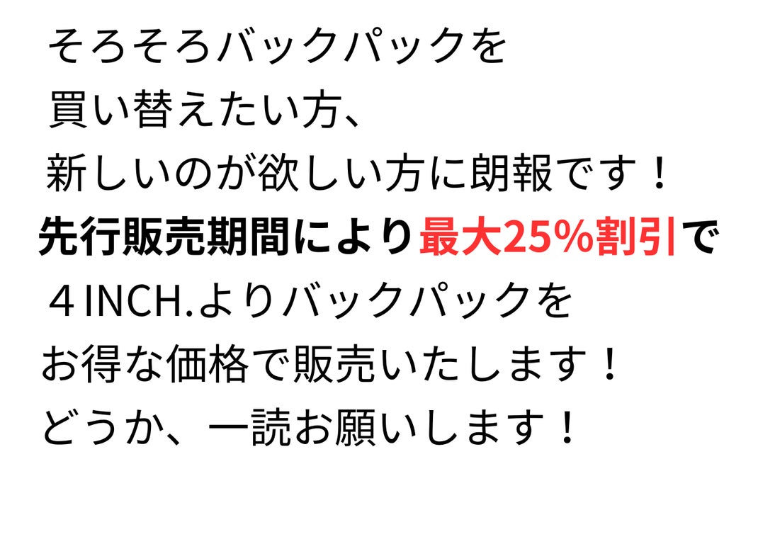 2024/09/19 12:57この度は、ご支援いただき誠にありがとうございます。すべてのご支援者さまへ商品の発送を致しましたのでご連絡させていただきます。さらに大手メディア『ライフハッカー(LIFE HACKER)』にて《4inch.Backpack》が紹介、掲載されましたのでご連絡させていただきます。【ライフハッカーページ】URL:https://www.lifehacker.jp/article/machi-ya-4inchbackpack-review-744622/4inch.は『今ここにないものはつくる』として様々なプロダクトを開発、製造しています。これからもよろしくお願いします。 ー4inch.プロジェクトチームー●4inch.オンラインストア URL:https://4inch.store/●公式LINE URL:https://lin.ee/LmAcElk もっと見る