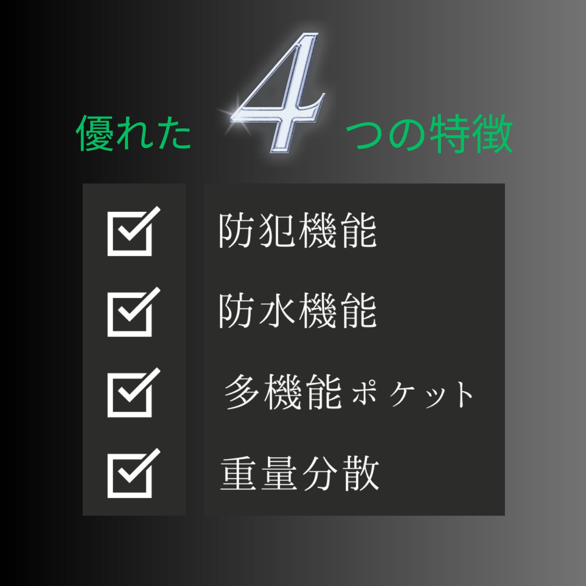 貴重品を安全に保管できる隠しポケットや盗難防止機能