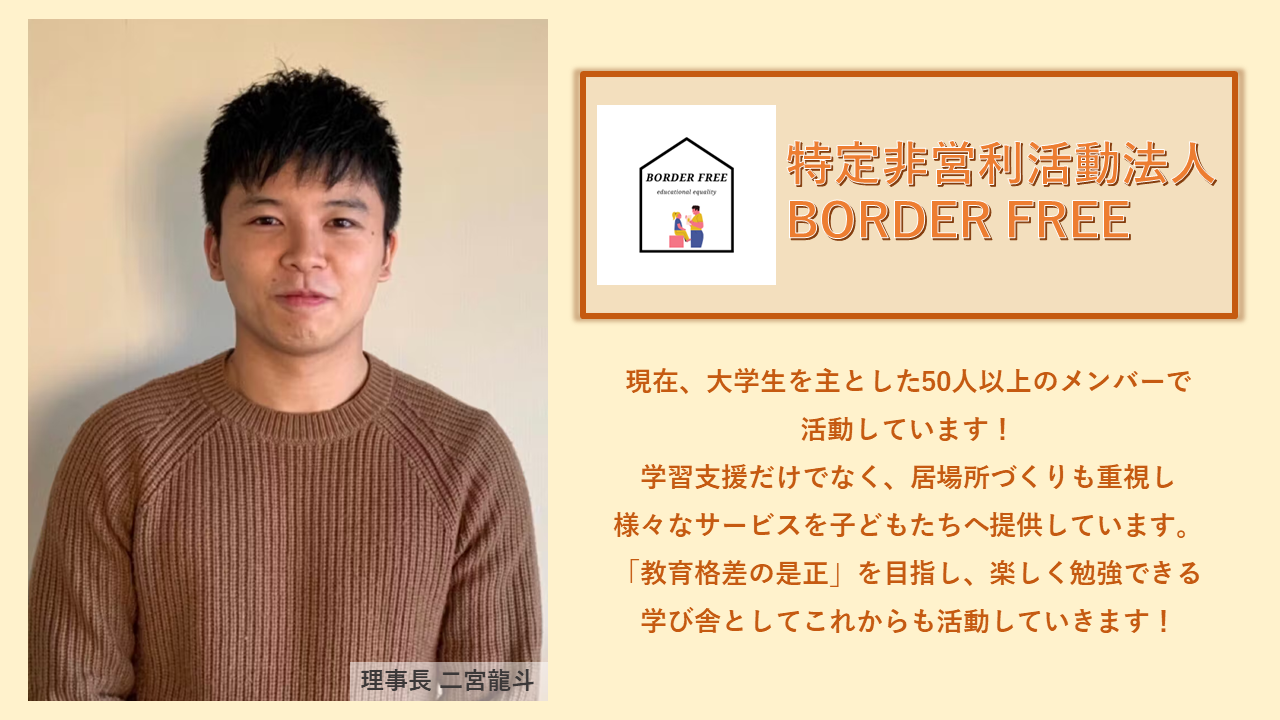 皆様、この度は私たちのクラウドファンディングページをご覧いただきましてありがとうございます。現在当法人で理事長を務めております、二宮龍斗(明治大学1年)と申します。