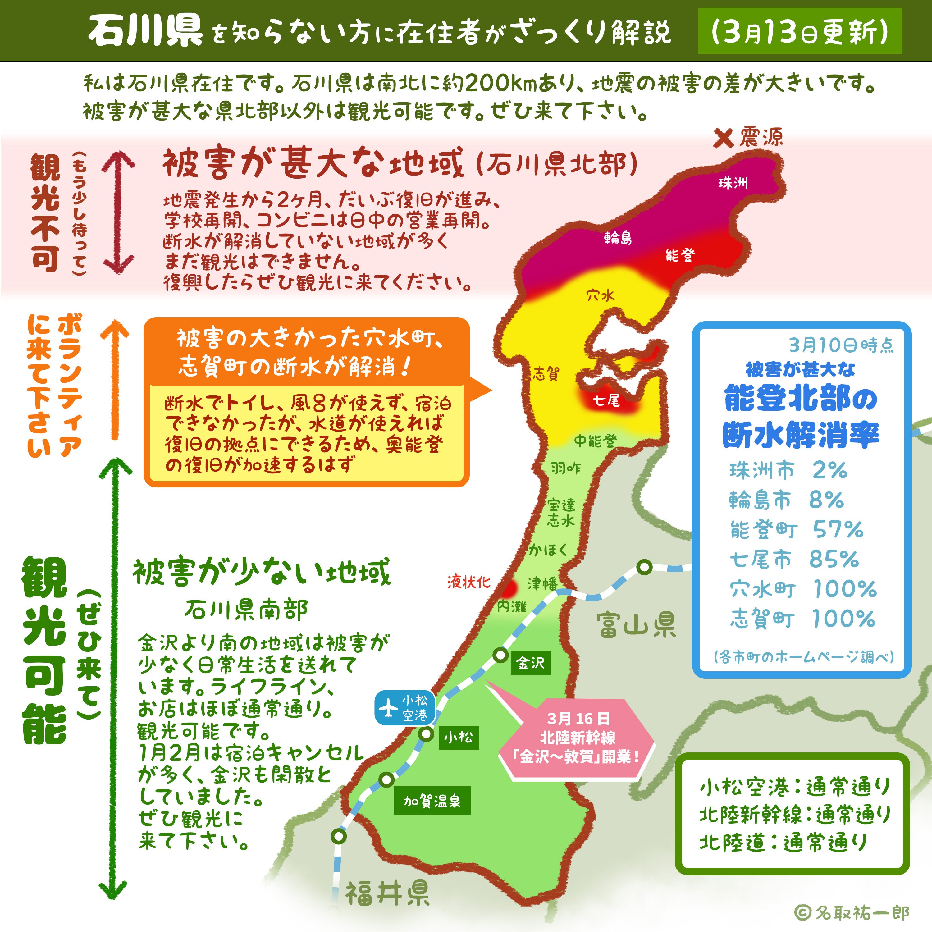 また、不要な旅行自粛や風評被害を招くことのないように、アニメ作家の名取祐一郎さまより、被災状況マップイラストをお借りしました。観光は身近にできる復興支援です。復興状況を見ながら、適切な時期に、ぜひ北陸へお出かけください。