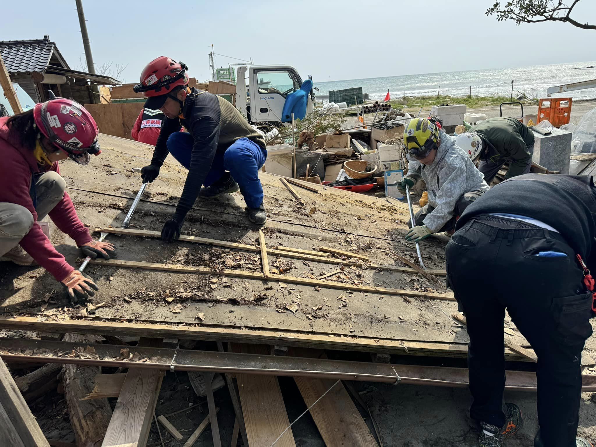 1月初期の避難所支援中心の活動から、少しずつ被災家屋が傷まないような簡易補修の活動が増え、ようやく個人宅の片付けや災害ゴミの搬出などの活動が増えてきたところです。