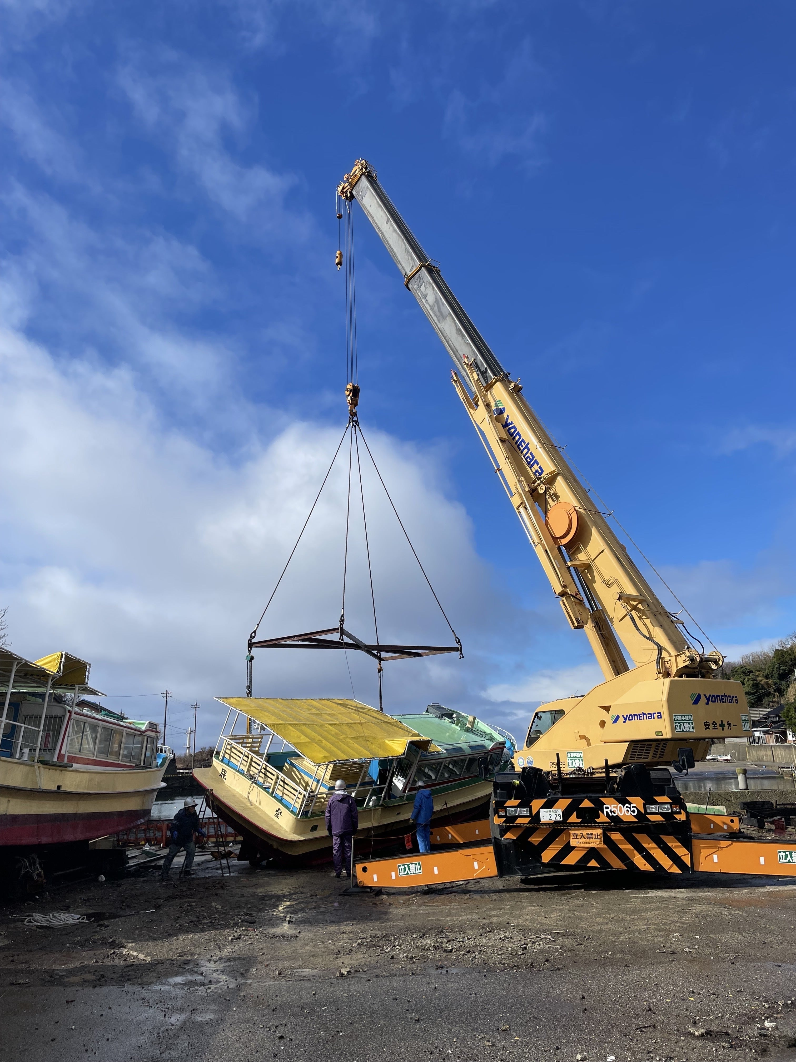 とりあえず、津波で流された、船を元の位置に戻さないことには何も始まらないので、大型クレーンで、仮普及作業を実施しました。船体外観は、それほど大きな損傷は見られないようですが、エンジン関係は、オーバーホールしてみないと、、、船を吊り上げるのも、船体は堤防に乗り上げており、材質がFRPなので慎重に行いました。オペレーターの方も神経を使ったでしょう!ありがとうございました。