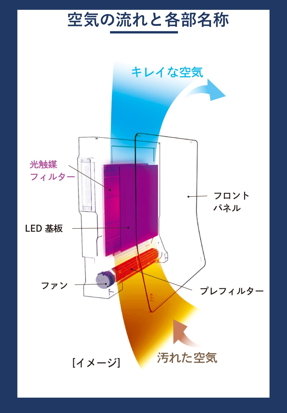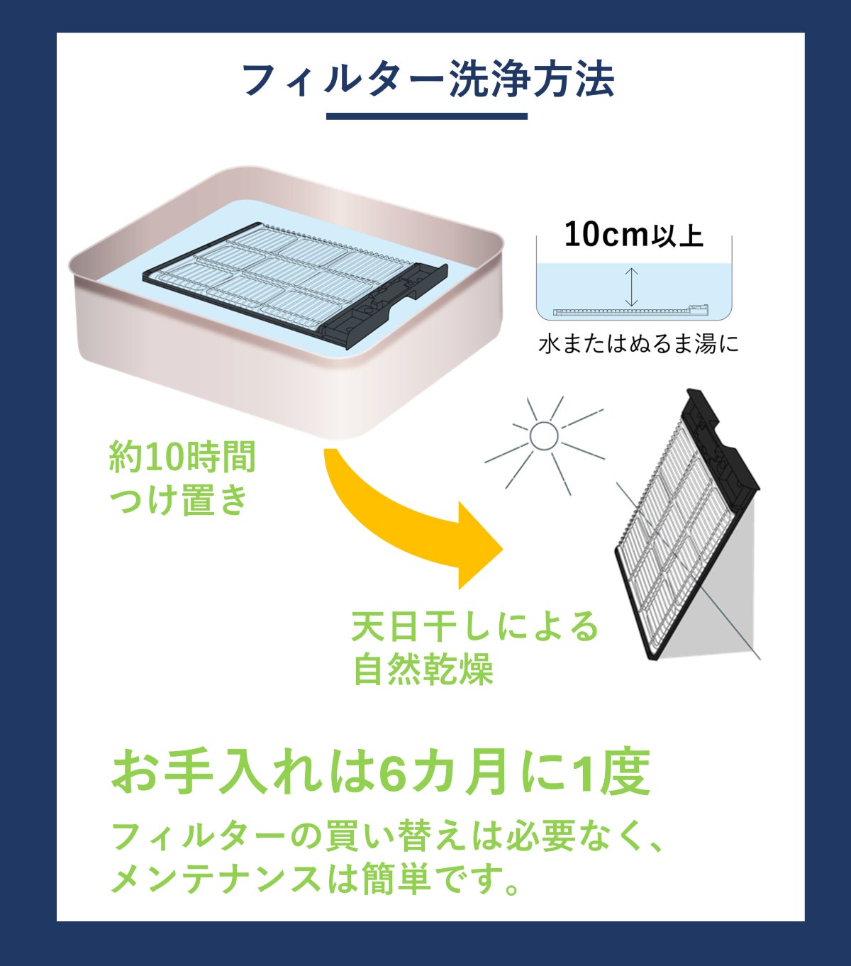 A:3か月に1度、光触媒フィルターをつけ置き洗いするだけです。プレフィルターは、水洗いするか、掃除機やエアーダスターをお使いください。