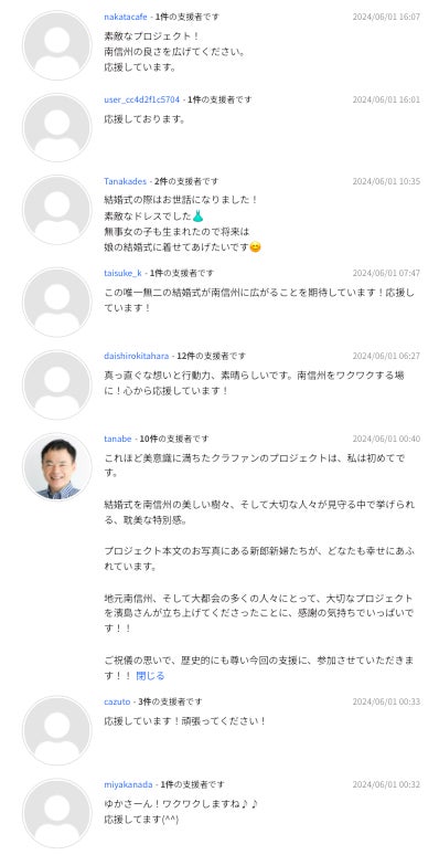 皆様の応援メッセージに励まされていますぜひ、一緒に飯田を盛り上げましょう!応援ありがとうございます。そんな風に言っていただけて嬉しいです!応援ありがとうございます、頑張ります。2回も連続で支援してくださってありがとうございます!頑張ります!!そのお気持ちが嬉しいので、微力だなんてとんでもないです!目標達成に向けて頑張ります。共感していただけるのがすごく嬉しいです!応援ありがとうございます、頑張ります。嬉しいことをおっしゃってくださいますね♡応援ありがとうございます。満足していただけるよう、誠心誠意頑張ります!応援ありがとうございます。頑張ります!!いつも応援嬉しいです、ありがとうございます。応援してくださって嬉しいです!頑張ります!プロジェクトを評価してくださってすごく嬉しいです!多くの方を幸せにできるよう頑張ります。成功祈願ありがとうございます!微力なんてとんでもないです、応援ありがとうございます。公開初日に引き続き、たくさんの方にご支援いただき応援メッセージを送ってくださり、ありがとうございます。皆さんのご支援と応援に支えられ、一人ではないことを実感します。こんなに温かい応援メッセージをいただけて幸せです。まだまだゴールは先ですが、今できることを日々重ねながら頑張ります!