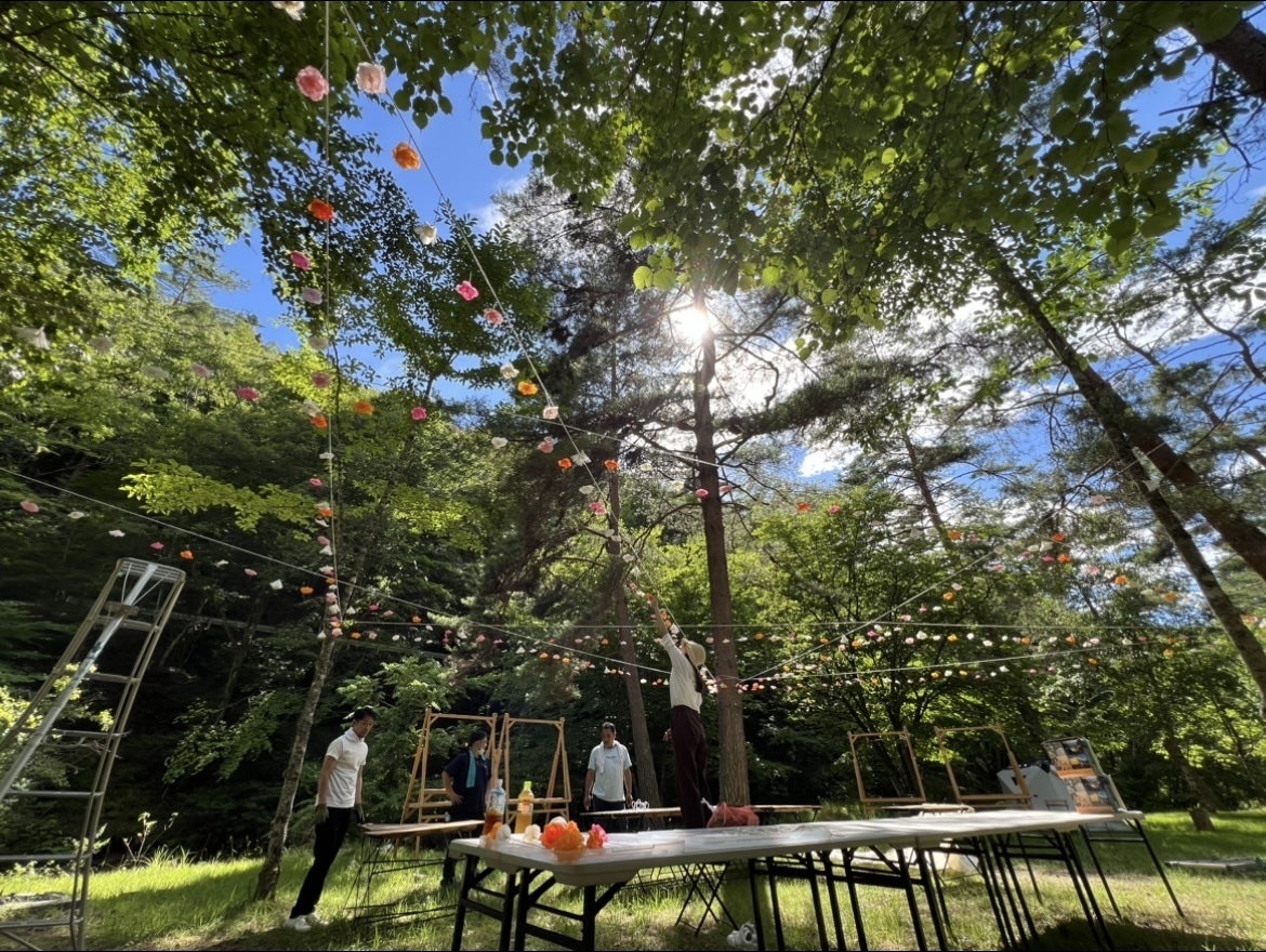 いよいよ結婚式前日です。会場となる野田平キャンプ場を結婚式仕様に装飾しました!パーティー会場の空間は、色とりどりのフラワーガーランドが上から降り注ぎ、太陽に透けてとても綺麗です。なんとこのフラワーガーランド、生花ではなく全て手作りなんです!!結婚式のために、新婦さん、ご兄妹、いろんな方がご協力くださり、特別感のある装飾に仕上がりました。シェードもつけて、日陰対策もバッチリです。普段はここにテントを張ってキャンプを楽しむ場所ですが、ガラッと雰囲気が変わりますね。ガーランドと一緒にLEDのストリングライトも付けたので、電気を灯すとロマンチックな空間に仕上がります!温もりのあるライトの光とお花の雰囲気がとっても可愛いく、夕方からのパーティーにもおすすめです。人前式の会場も緑が映えて気持ちの良い空間になりました!ちょうどいい感じに木々が茂り、木漏れ日の下に会場を作ることができました。バージンロードには、当日お花を生けて道を作ります。自然を活かした会場だからこそできる演出です。南信州ウェディングは、今後、自然豊かないろんな場所で展開する予定です。自然の中で結婚式を考えていらっしゃる方や、自分たちだけのオリジナルの結婚式をやりたい方におすすめです。また、ドレスやタキシードも全てオーダーメイドでお作りしますので、衣装もお任せください。興味のある方はぜひ、応援をよろしくお願いいたします。