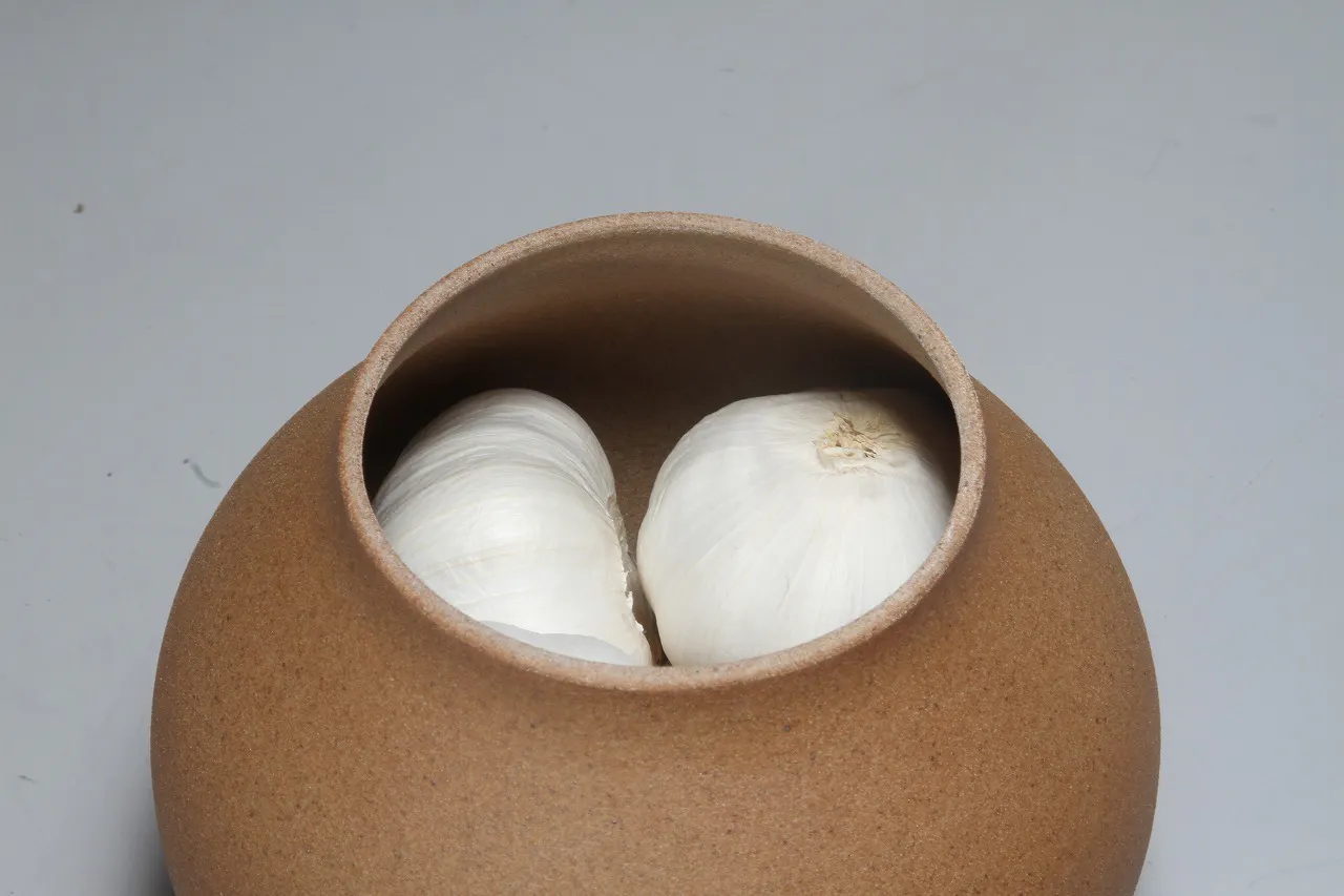 素焼きで通気性のいい陶器はガーリックポットにお勧め。にんにくは殻のまま入れ、風通しの良い日陰になる場所での保管をすれば、約1ヶ月程度、風味を逃がさずに保管できます。