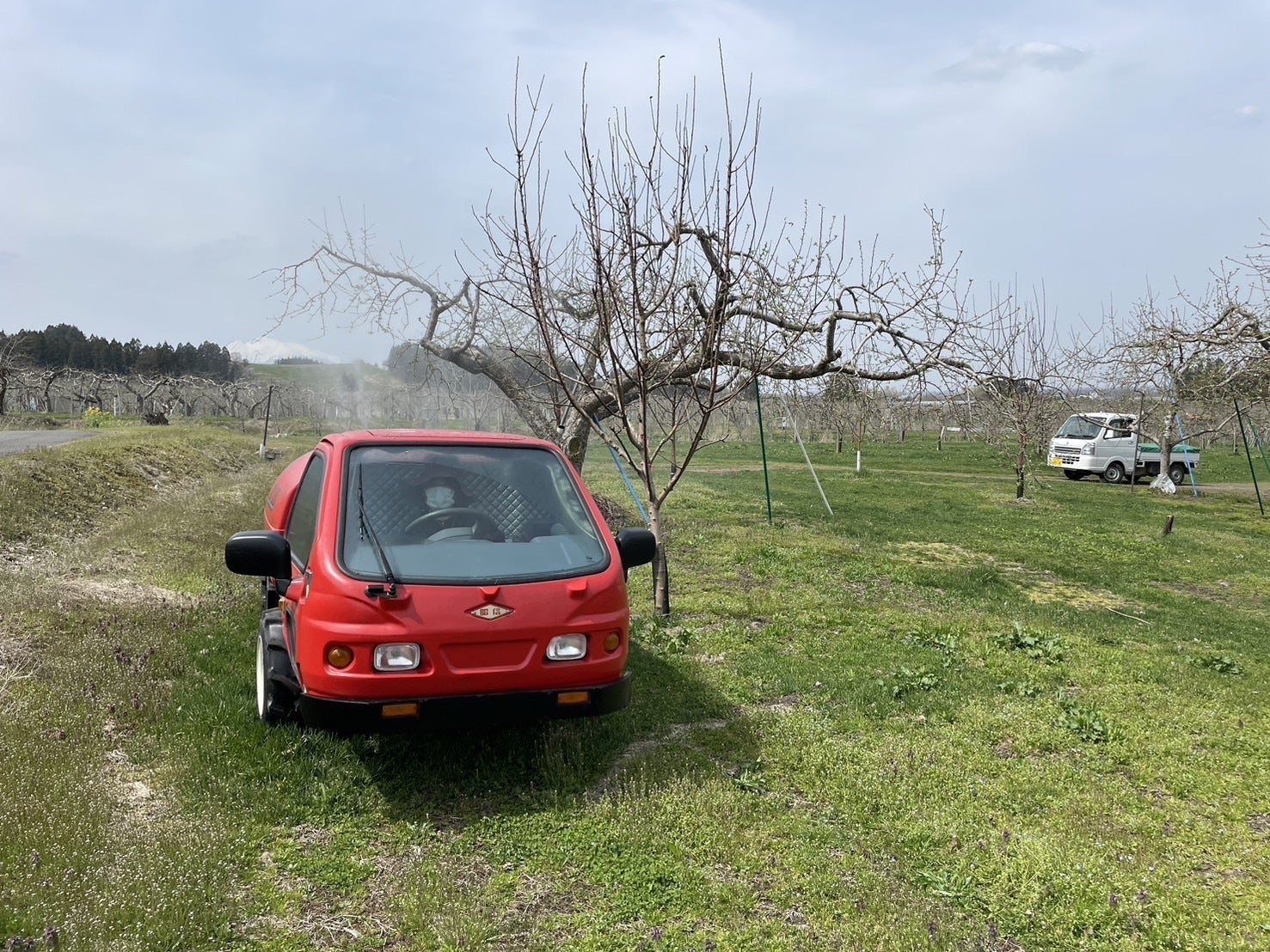 中古で購入した、かわいいかわいいスピードスプレーヤー。今の時期にしっかり薬剤散布をすることで、「黒星病」という厄介な病気を防ぐことができます。