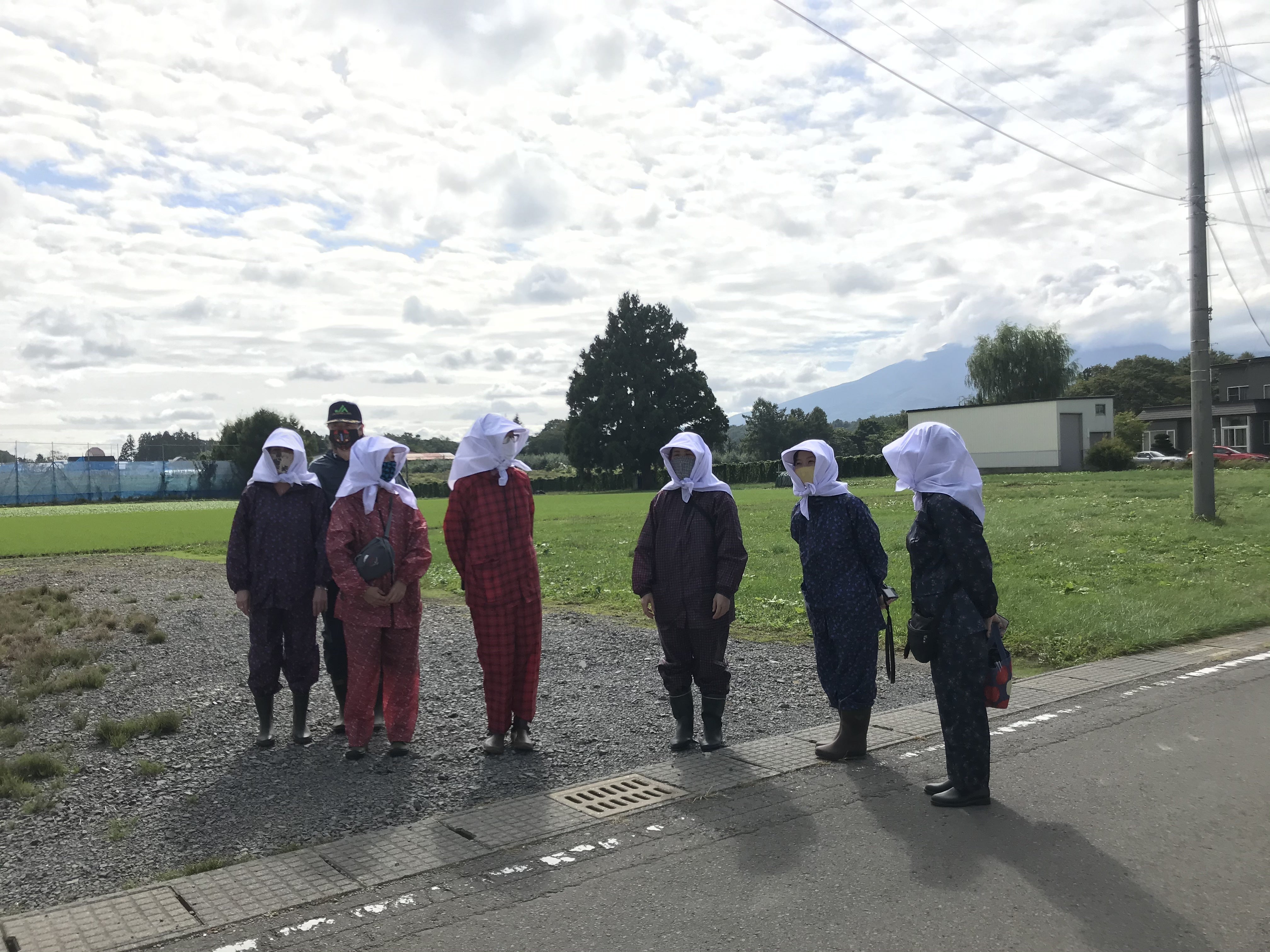 日除けの被り物と“ヤッケ”スタイル。さまざまな模様のヤッケが、普通にホームセンターで販売されている風景が大好きです。今回のクラファンでも、そんなりんご農家の格好をして、りんご畑で作業をするような体験ができるリターンをご用意しております。