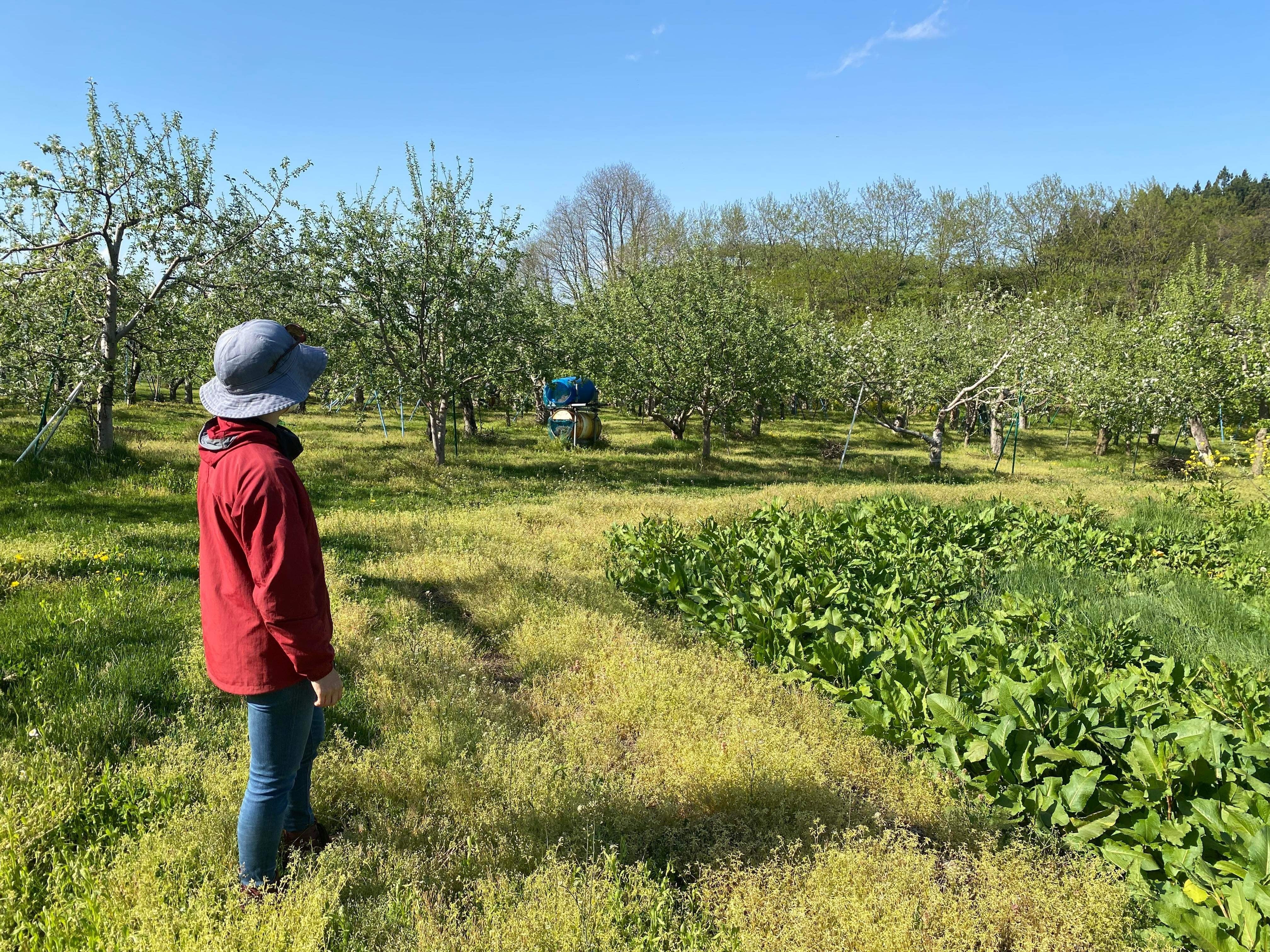 この辺りはちょうどりんごの花の時期で、小高い山の中の畑に向かう道の両脇は、白い花の花道になっていました。自然の歓迎ムードに包まれながら畑に到着すると温子さん一家勢揃いで作業中。「畑を作ったことが(離れて暮らしている)家族の集合のきっかけになっているなら嬉しいな~」と話していた温子さんにほっこり癒されました。