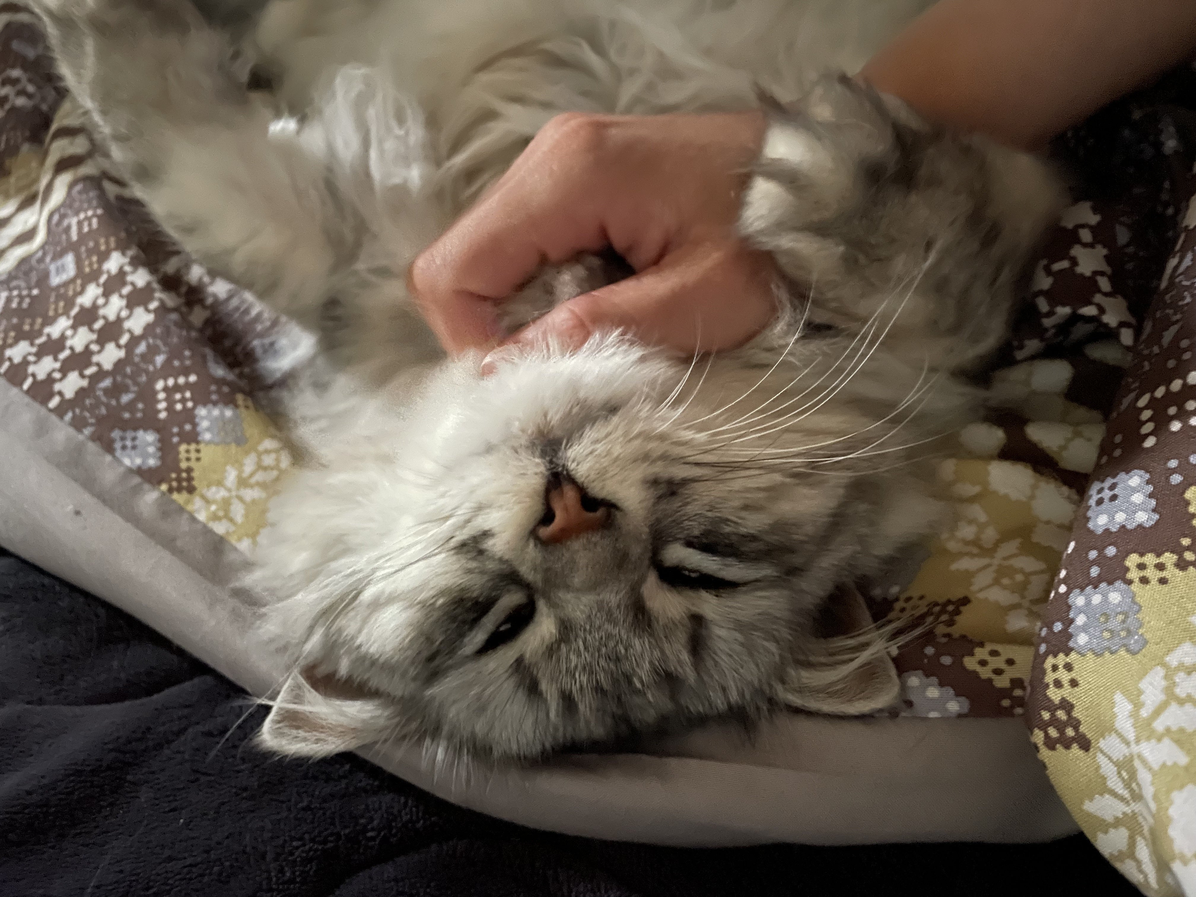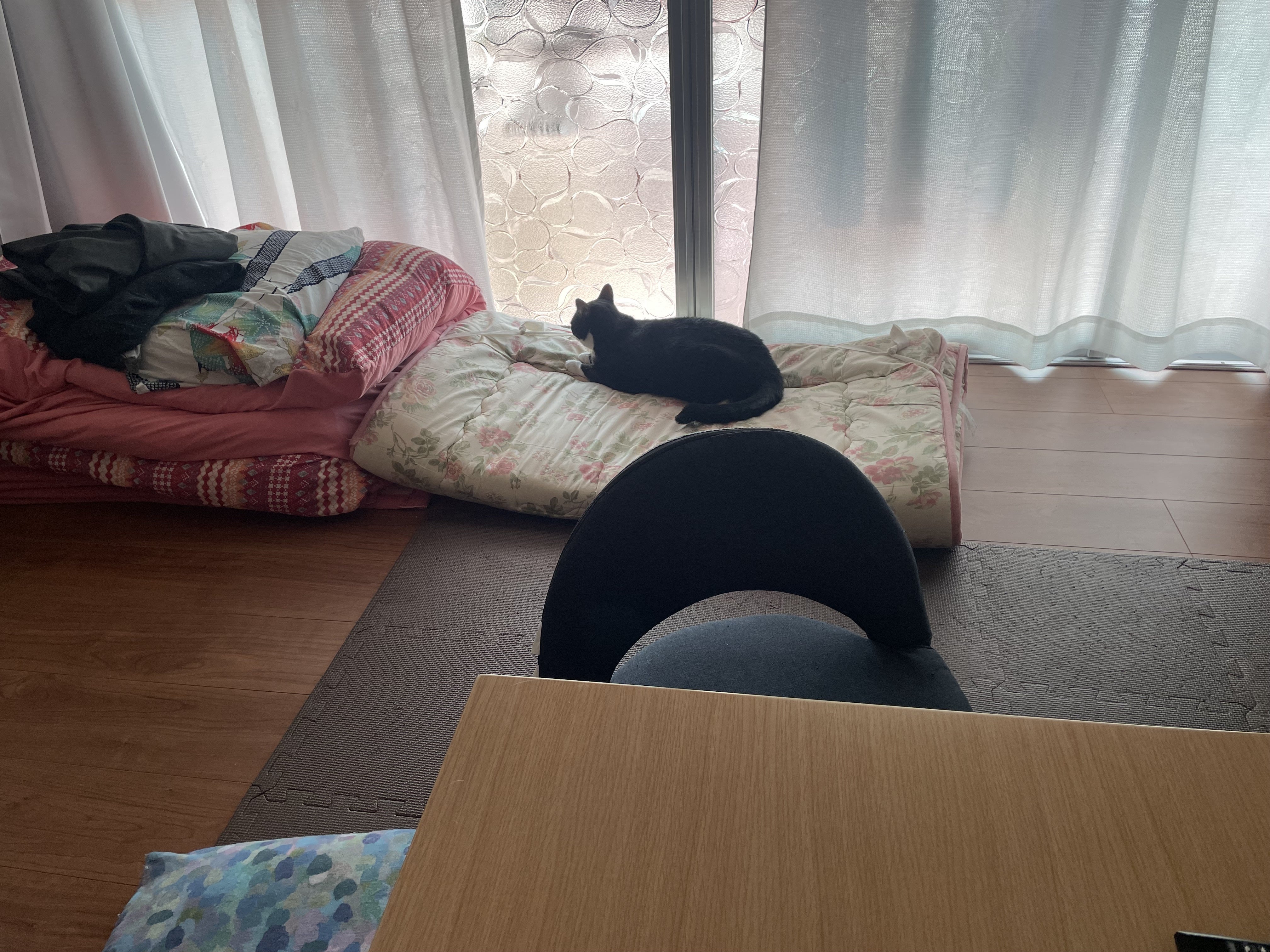 お留守番は、母の敷布団の上。自宅警備中