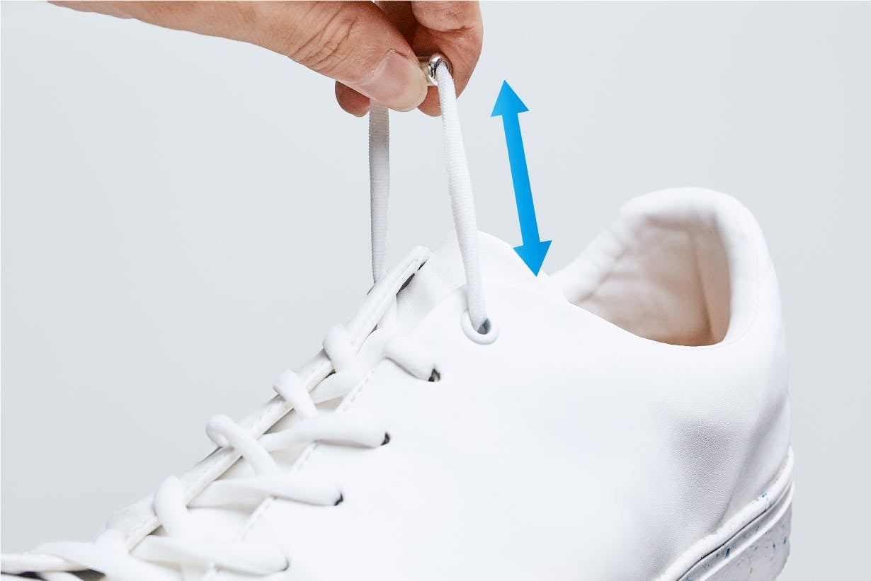 一つは最初から付いている「普通の紐」です。見た目シンプルで「品の良い」「大人白スニ」のそのままにイメージで履けます。もう一つはご紹介した「伸びる靴紐+スマートジョイント」をお付けします。ご自身の足に合わせて調整できます。是非、ご体感ください!