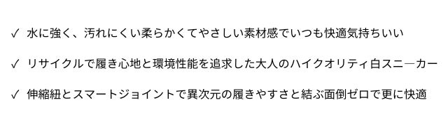 本作は「とことんシンプル」に且つ「上質な大人の白スニ」を目指し「履き心地と快適さ」更には「水に強い」リサイクル素材で作った白スニの「自信作」です。