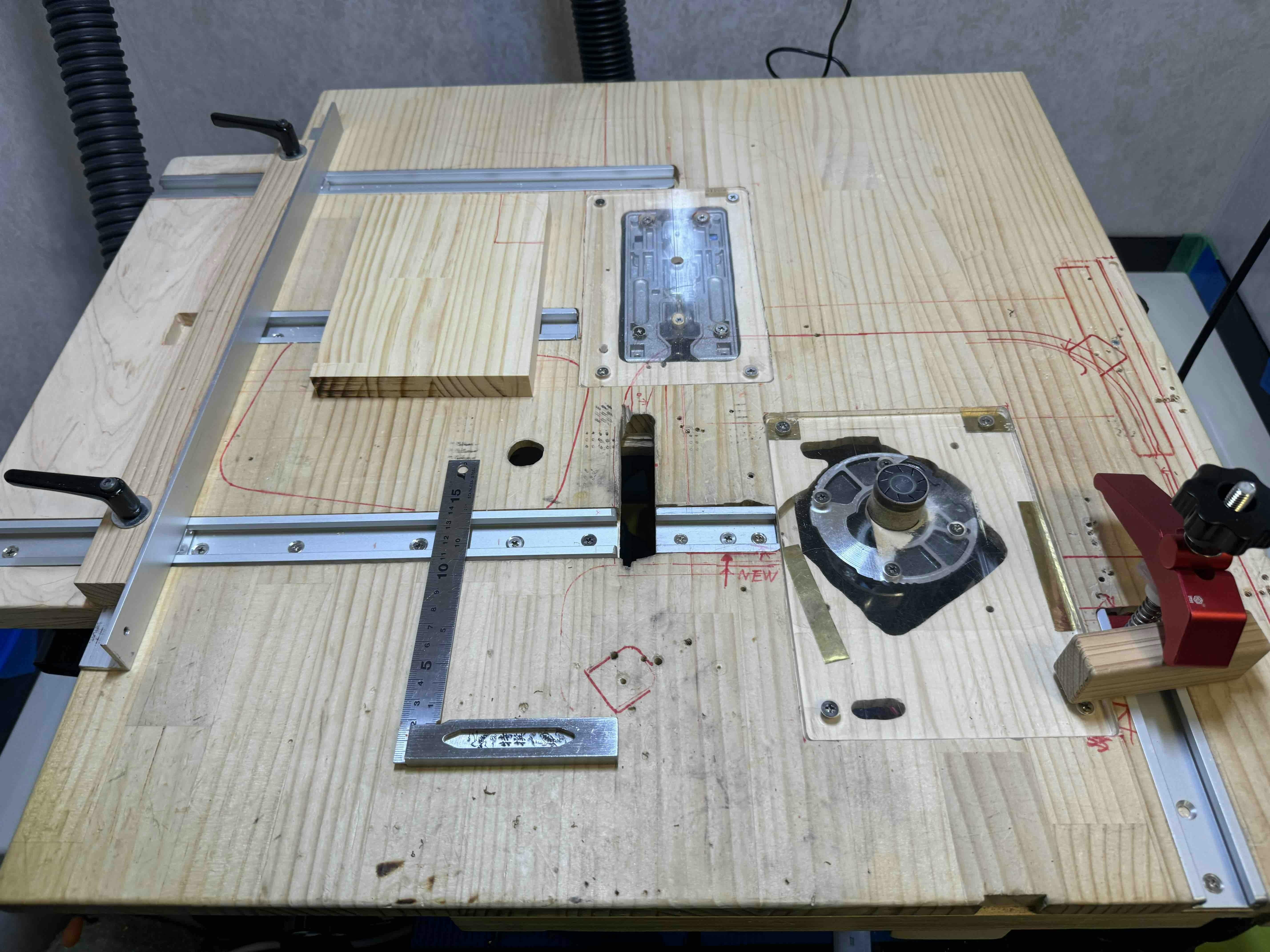 知恵を絞って一つのテーブルで切断と仕上げができる様に準備してきました。テーブルの下には集塵機を設置しており
