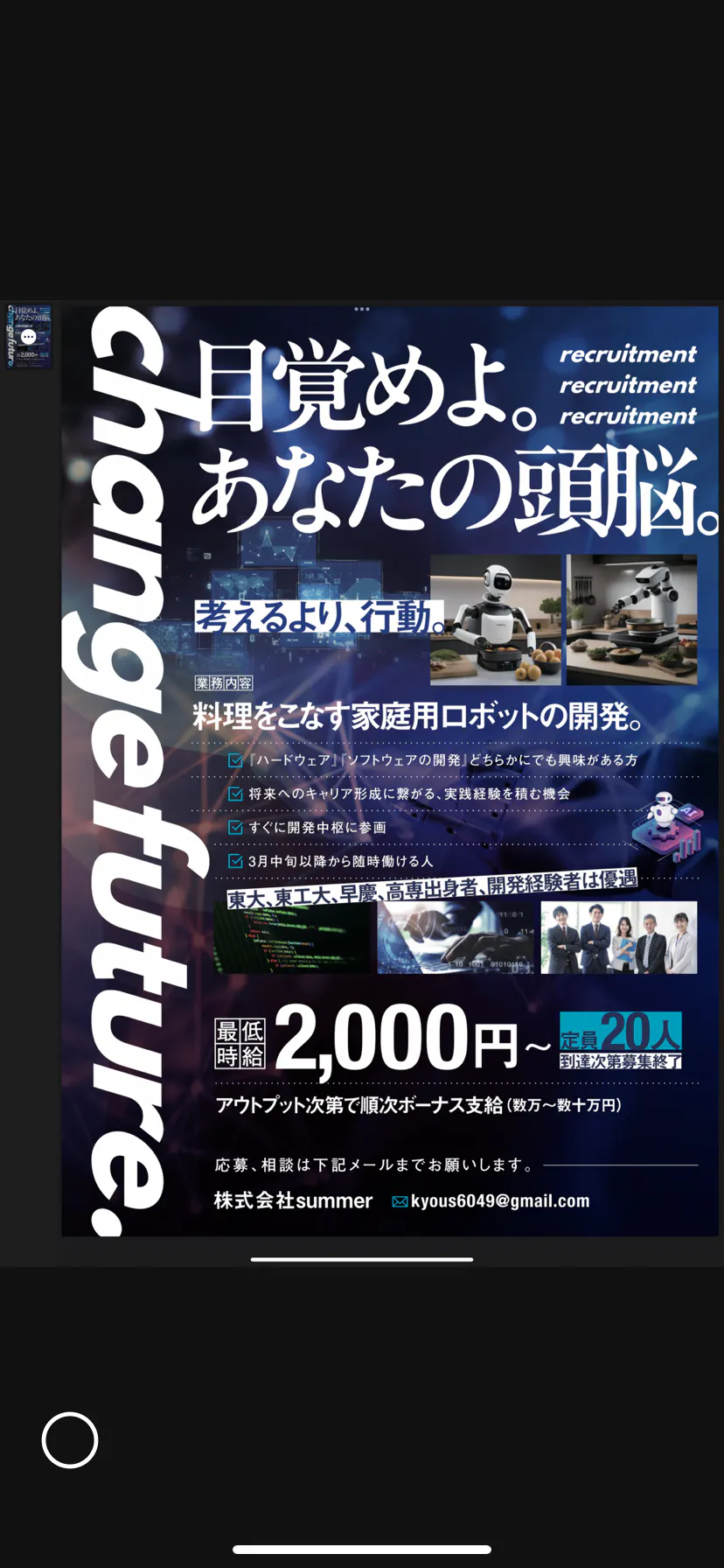 開発には大変な技術力を動員する必要がありますので、開発経験者、東大、東工大等の学生と開発を進めて参ります。各大学で、ロボット研究室やロボットサークルなどが設けられておりますし、未経験でも工学系の生徒を中心に採用して参ります。また、ロボット分野への研究を長年されている某教授の技術顧問への招聘も水面下で進めており、共同研究等の機会も積極的に作り、最短距離で開発を進めて参ります。