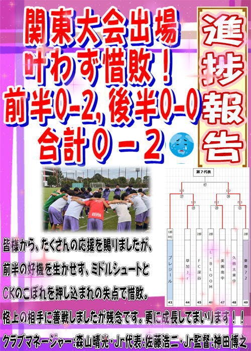 2025/09/23 18:08この年代の最高峰の大会、高円宮杯埼玉県代表決定戦の代表決定の試合において、残念ながら0-2の敗戦となりました。練習の成果も出ていましたが、相手ゴールを奪うことができませんでした。選手たちも悔しさを滲ませていました。涙を流す選手もいました。応援してくださる皆さんの期待も感じていた選手たちです。それでも、結果は出てしまいました。次は、現在の県リーグの残留が目標となります。まだまだ、成長を続け、選手たちと頑張ってまいります!!今回も多くの皆様の思いを感じております。更なる決意で頑張ります!今後ともよろしくお願いいたします!クラブマネージャー森山晴光・Jr代表 佐藤浩二・Jr監督 神田 博之 もっと見る念願の関東大会まで、あと1勝です!9/23(祝火)10:00キックオフ!!