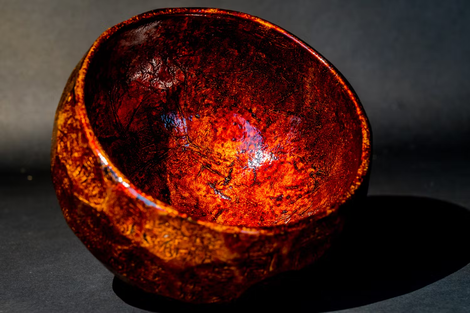 漆<うるし>は乾燥しても、作品の内部で生き続けていることから、透明感を増します。漆は年数を経て、徐々に透明になり、透けてくるなど、幾度も塗るうちに色がプリズムのように、光を吸収・分散・屈折して、はじき出し、異なる輝きを見せます。