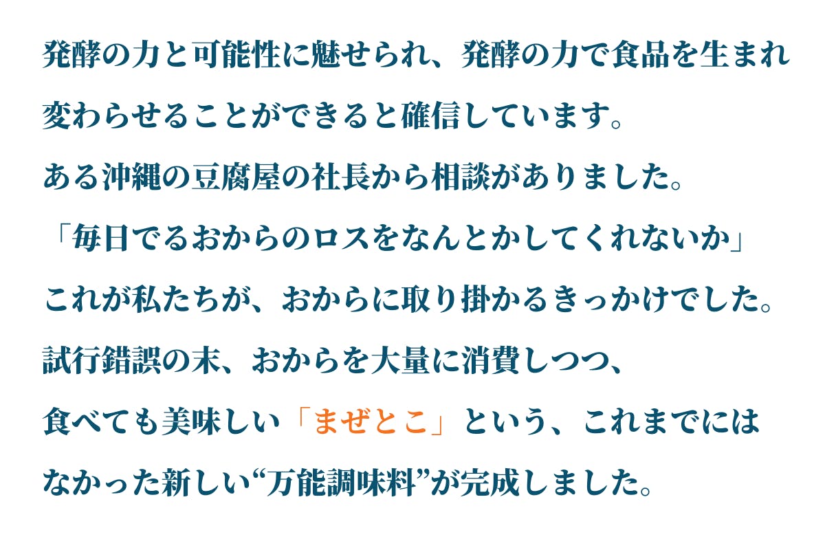 ・まぜとこ:おからと米糀を混ぜて発酵させ、塩糀やニンニク、生姜、唐辛子で味付けをした万能調味料です。