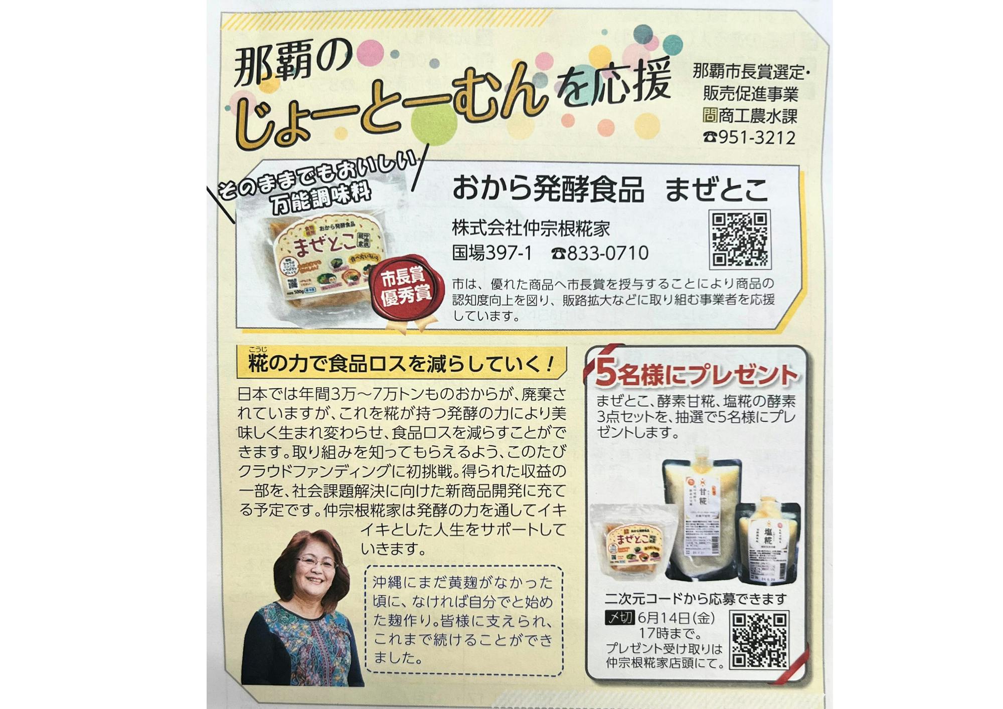 この広報誌を見て、応募フォームからご応募いただいた方の中から抽選で5名様に、まぜとこを含む仲宗根糀家の人気商品3点セットをプレゼントいたします。