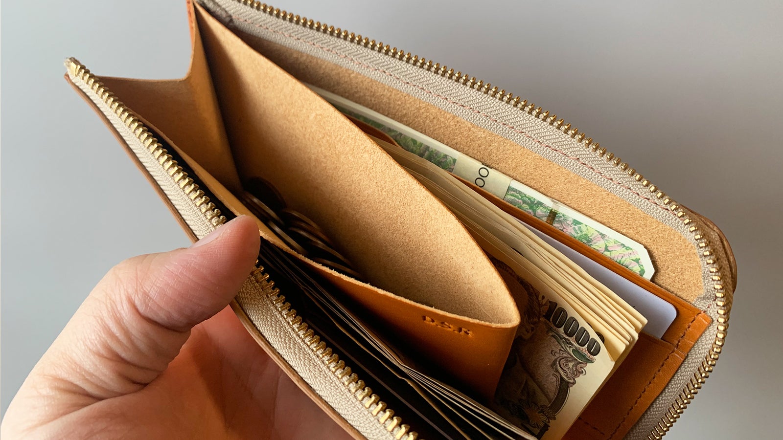左右に2枚づつ収納スペースを分けてあり、ポケットスペースも余裕をもたせて作ってあるので出し入れもスムーズ。会計の際にもたつく事もありません。