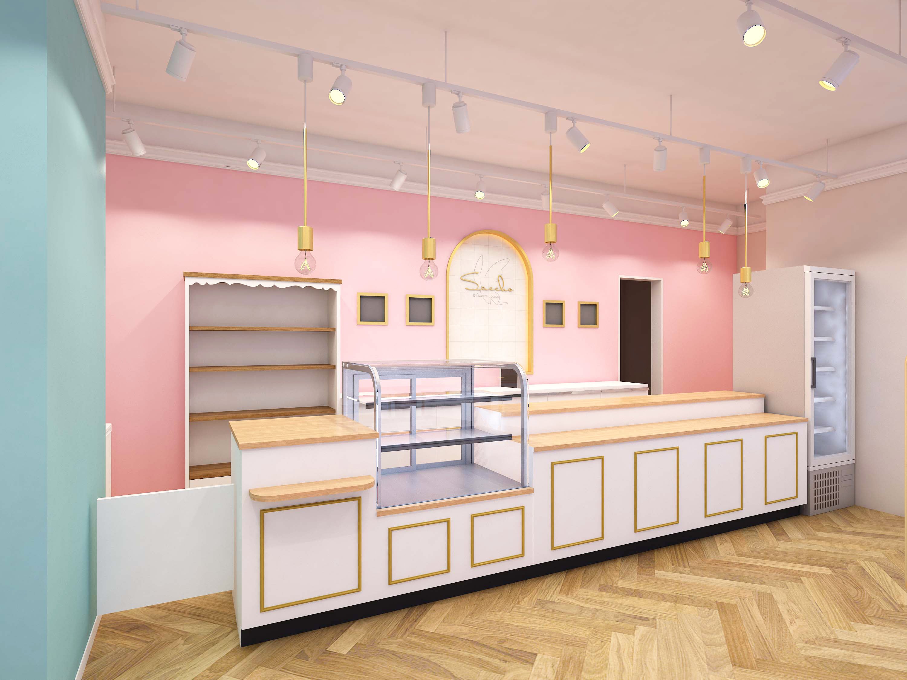 スイーツ店らしく、Sacchoイメージカラーである薄ピンクを取り入れ、清潔感のある店内作りにしました。