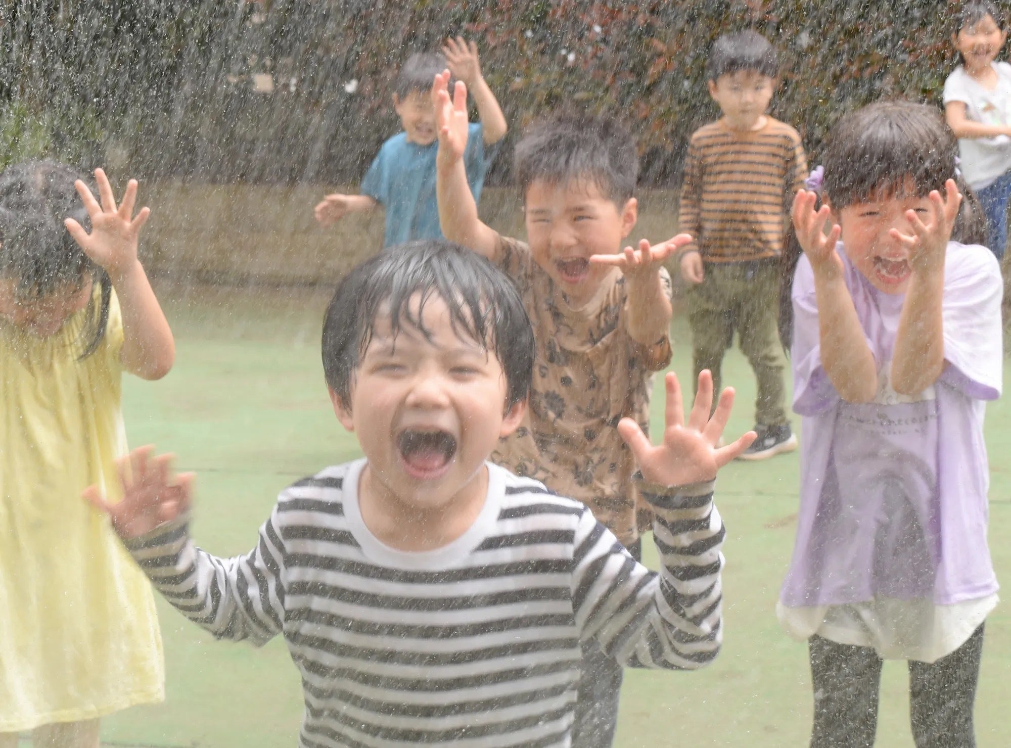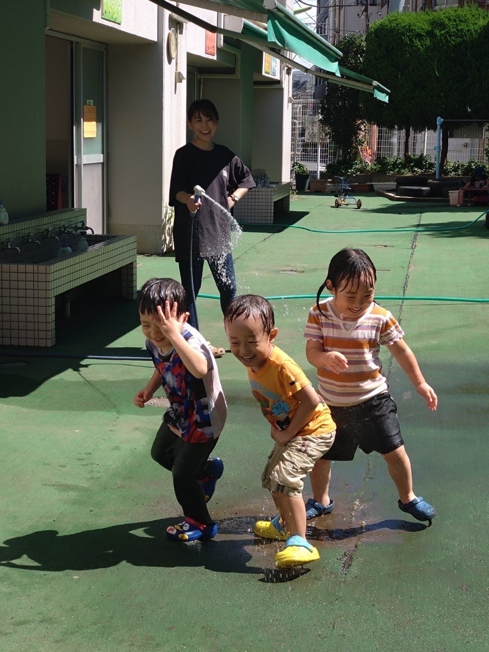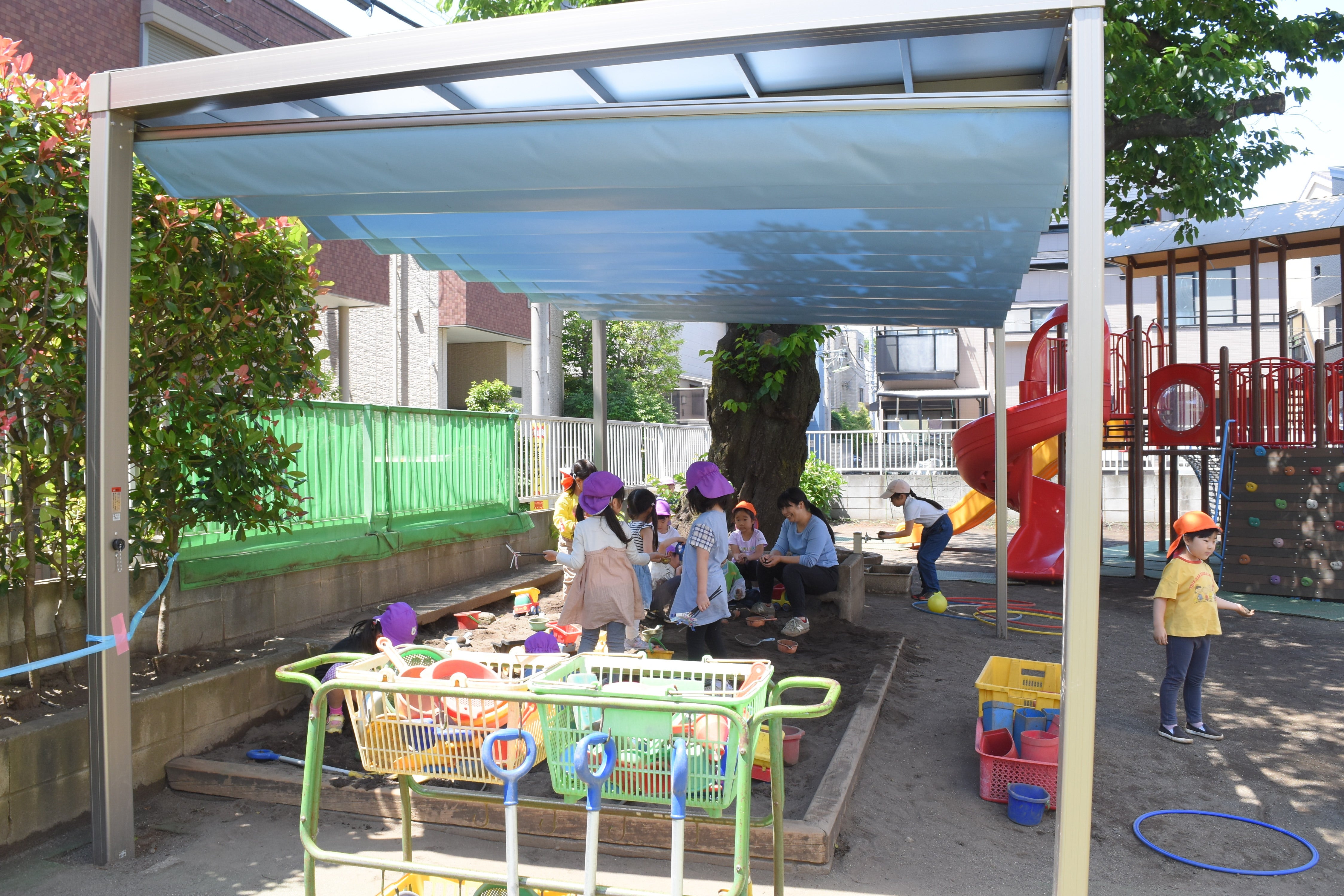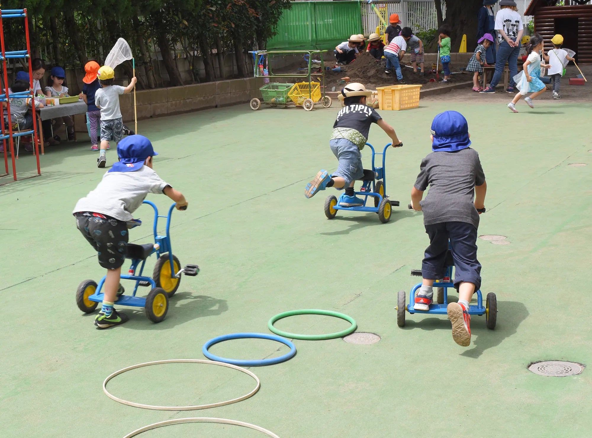 毎日の遊びの舞台である園庭 運動場にも 水遊び場にも 三輪車のレース場にもなります