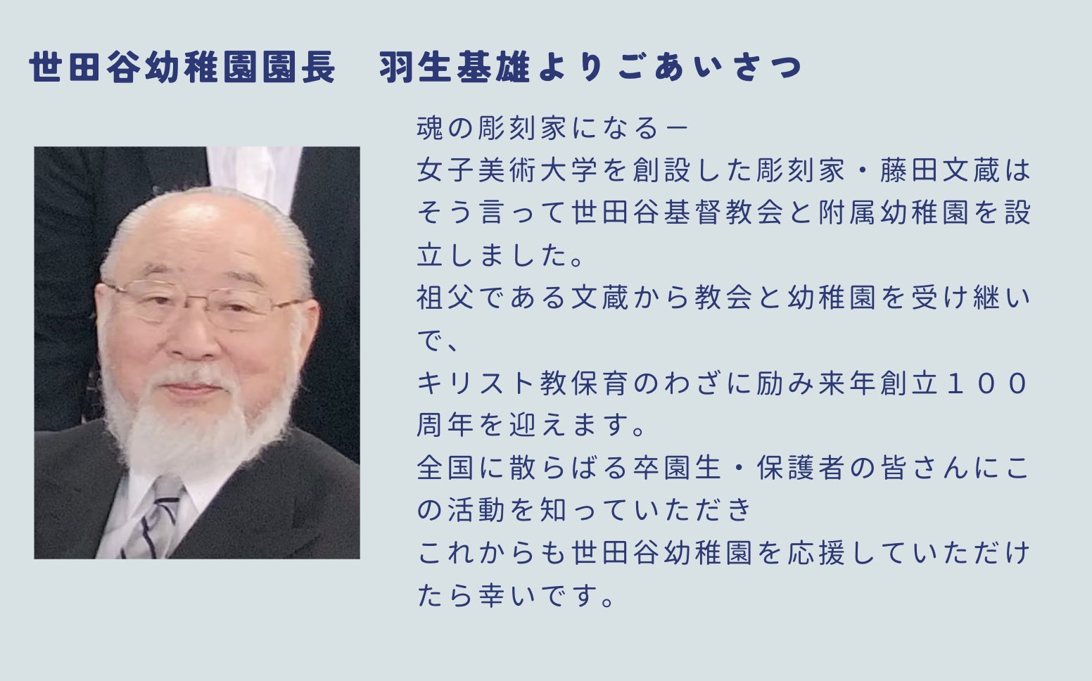 2024/05/31 20:38おかげさまで本日をもってプロジェクトを終了するにあたり、目標額の200万円を超えるご寄付を頂戴し、延べ120名を超える方々からのご支援をいただきましたことを、略儀ながらこの場で御礼申し上げます。ほんとうにありがとうございました。写真の貼り絵は、昨年のすみれ組さんが一枚いちまい丁寧に貼ったものです。薄く淡い色の花びら、飛んでいってしまいそうな儚いひとひらも、集まるとこんなに鮮やかで立体的な花になり、力ある一つの作品に仕上がっています。園庭の大木の桜はもう花を咲かせることはできませんが、卒園生や保護者の皆さま、地域の皆さま等たくさんの方々の力が寄り集まって、ここに目標のサクラを咲かせることができました。幼稚園の建物のあちこちが古くなって修繕が必要になり、また園庭で長年にわたり園児の成長を見つめ続けてきた桜の木を伐らなければならなくなって、このプロジェクトを立ち上げ、皆さんに応援していただいて、多くのご支援を賜ることができました。そしてご寄付だけでなく、三代にわたってお世話になりました、親子ともどもとても良い時を過ごさせていただきましたなど温かいメッセージをたくさん頂戴しました。世田谷幼稚園への皆さんの思いが伝わってきて、職員も100周年事業に携わる教会員も感動のうちにこのプロジェクトを閉じることができますことを心より感謝しております。植樹した新しいソメイヨシノは来春また背を伸ばして花を咲かせてくれることでしょう。頂戴した寄付金は遊具の保全や保育室の修繕のために有効に活用させていただきます。今後とも世田谷幼稚園の応援をよろしくお願い申し上げます。皆さんが遊びに来てくださるのを心よりお待ちしております。 もっと見る目指せ支援者100人超!ご支援に感謝
