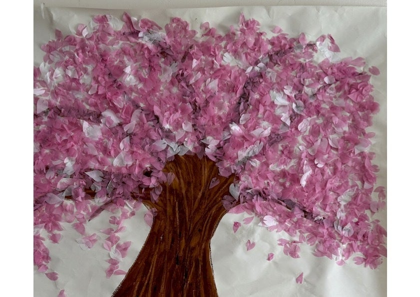 年長「すみれ組」の子どもたちによる園庭の桜の貼り絵