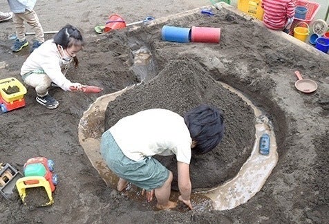 新しい木枠の砂場で思う存分遊んで欲しいです