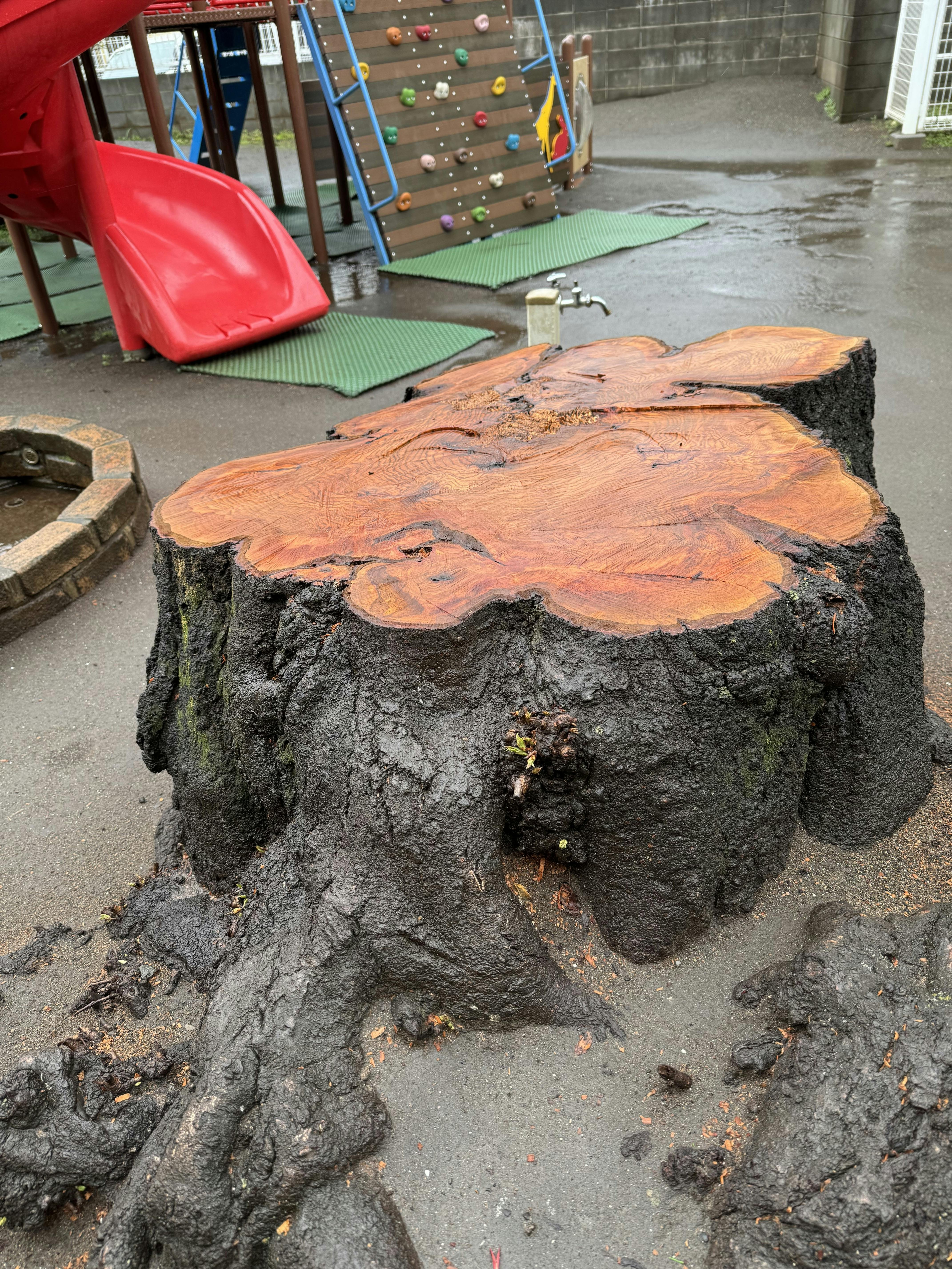 クレーン車出動してまず上の枝を切り落とし、最終的には根元で切ってもらいました。切り株は予想以上に大きく、年輪は想像していたよりも波打っていますが、子どもたちにも1本の大木の歴史を感じてもらえる大切な教材になることでしょう。