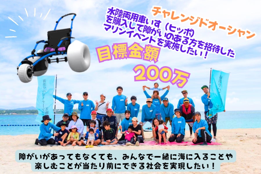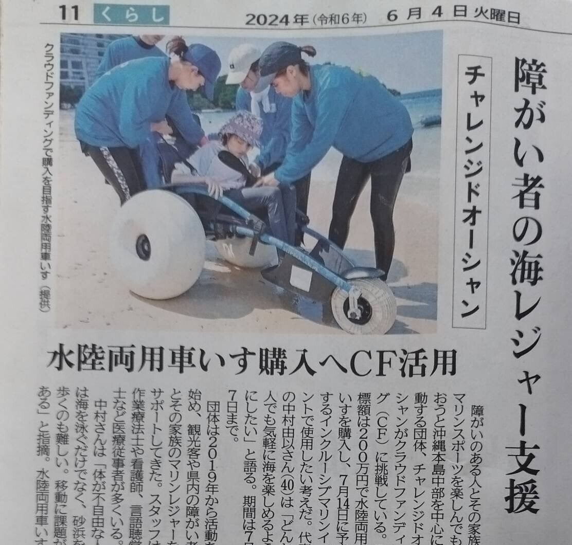 2024/07/09 21:097月7日に無事クラファン終了致しました!目標の200万には届きませんでしたが、113人の皆さまのあたたかい応援やご支援のおかげで100万達成となりました!心から感謝申し上げます。皆さまからいただきました支援金の全ては、水陸両用車イスの購入費用と、7/14のインクルーシブマリンイベントの運営費にあてさせていただきます。私たちにとってもクラファンは初めてのチャレンジでしたが、多くの皆さまに活動を知っていただく機会になり、あたたかい応援の言葉をかけていただいた事は、とても励みになり今後活動を継続的に行っていくための活力となりました。購入した水陸両用車イスは、チャレンジドオーシャンの活動だけではなく、必要な方に活用してもらえるように、どなたにでも無料で貸し出しを行う予定です。(※安全に使用していただく為に、事前に使用方法は学んでいただきます)まずは、この場をお借りしてお礼を申し上げます!ありがとうございました。そして、今週7月14日(日)はいよいよインクルーシブマリンイベントを開催します!また活動の様子は、SNSやリターンの活動報告動画を作成後、提供させていただきます。どうぞ楽しみにされていてください!チャレンジドオーシャン代表中村由以 もっと見る【沖縄タイムスに当プロジェクトが掲載されました!】