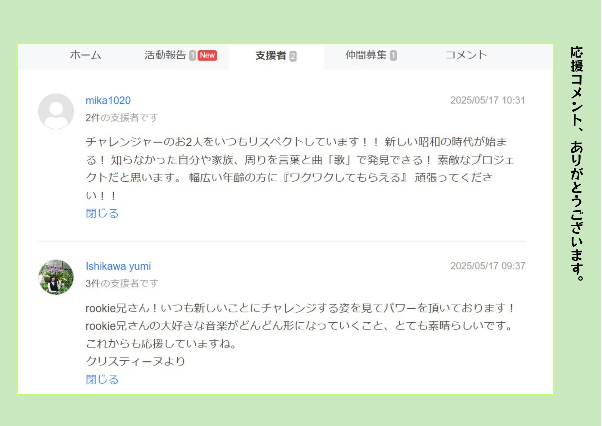 プロジェクトの公開初日、温かい応援コメント、いただきました。