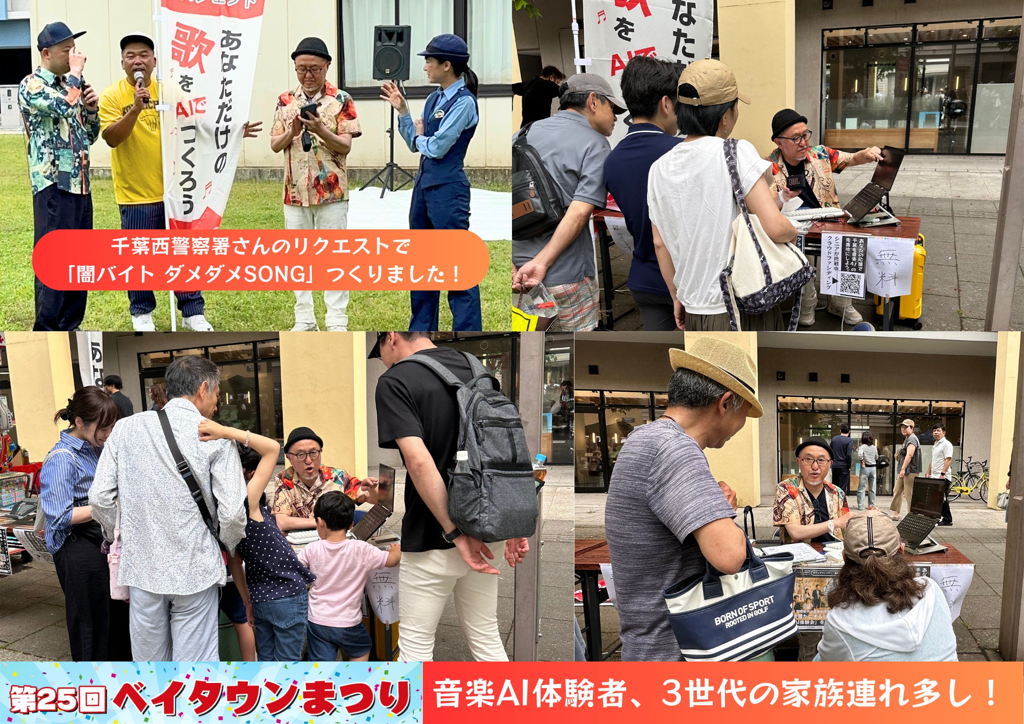イベントステージでは、よしもとの千葉県すみます芸人のもぐもぐピーナッツさんのMCで、音楽AI体験を盛り上げてもらったり、千葉西警察署の「闇バイト防止?」キャンペーンで参加されていた警察官の方のリクエストで「闇バイトダメダメSONG」つくったりと、盛沢山な出来事だらけでした。詳しくは、続報にて!