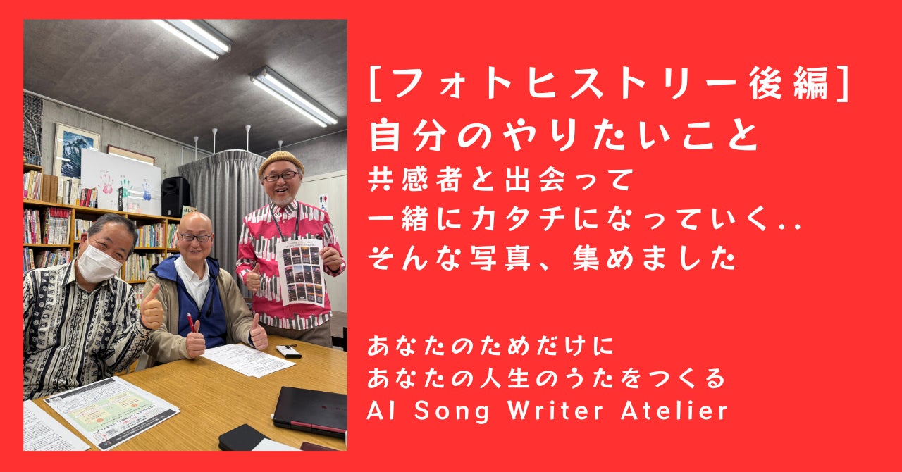 この日は、4人の方からじっくりと人生のお話を聞きながら、依頼者の方ととなきちと会話しながらファシリテーションをして「あなたが、2025年の暮れに思う人生の一曲」、しっかり制作させていただきました。