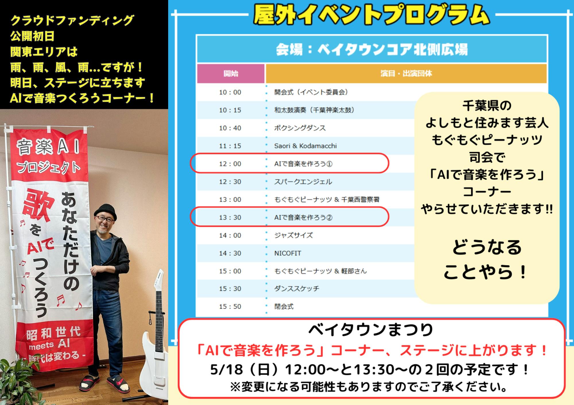 チャレンジ初日、関東地方は雨、雨、風、雨5月17日(土)、おはようございます。今朝、クラウドファンディング、公開となりました。最初のご支援もいただきました!ありがとうございます。私は50歳から始めた「ひと前演奏活動」、アコースティックギター弾き語りでのストリートミュージシャン活動も17年が過ぎました。小学生の頃から世界中の音楽を聴き始め、ギターも始めて。中学高校時代は4つのバンドを掛け持ちもしてました。社会人になってから音楽活動は「0」そして、演奏活動を始めてからも、自分で作詞作曲するのは困難を極めて。オリジナルは17年で1曲。そんな私が、昨年66才で「これからは生成AIの時代じゃ!」と時代の刺激を受けて猛勉強し「認定:生成プロンプトエンジニア」になり。プロンプト叩く日々が始まり。そして音楽生成AIの技術の爆速進化を目の当たりにして「これだ!」と思い立ち、今回のプロジェクトのプランニングを始めました。私も生成AIのおかげて、自分のアタマの中にあった「小さな想い」を多様な詞にすることが出来ました。私のイメージで「こんな曲にしたいな」ということも、音楽生成AIのおかげて、何度も繰り返して生成しまくって、自分の音楽をつくることが出来ています。AIくんは(AIちゃんとも、時々呼びます)、文句も言わず、繰り返し曲を出してくれます。(笑)←ここが、サイコー!この体験、実感、感動を同世代、先輩諸姉諸兄にもお伝えしたい!皆さんと一緒に昭和世代からこそできる「歌詞とサウンド」を生み出したく、その第一歩としてのこのプロジェクトを立ち上げました。若い方は、皆さまのご両親や祖父母様に「こんなのがあるよ」とお伝えください。昭和世代の皆さま、一緒に活動が出来るプラットフォームづくりの第一歩をご一緒しませんか?そんなチャレンジ、始まりました。これから6月30日の終了期限まで、このプロジェクトの拡散のご協力、ご支援、よろしくお願いいたします!三野 rookie 晃一※あ、UPした画像にもありますが、明日は幕張ベイタウンのイベントで、ブース出店だけでなく、なんと「ステージで音楽AI、やろうよ!」と声を掛けていただきステージに上がります!どんなステージになるんだろう?千葉県のよしもと住みます芸人さんの司会で、遊んでもらいます!
