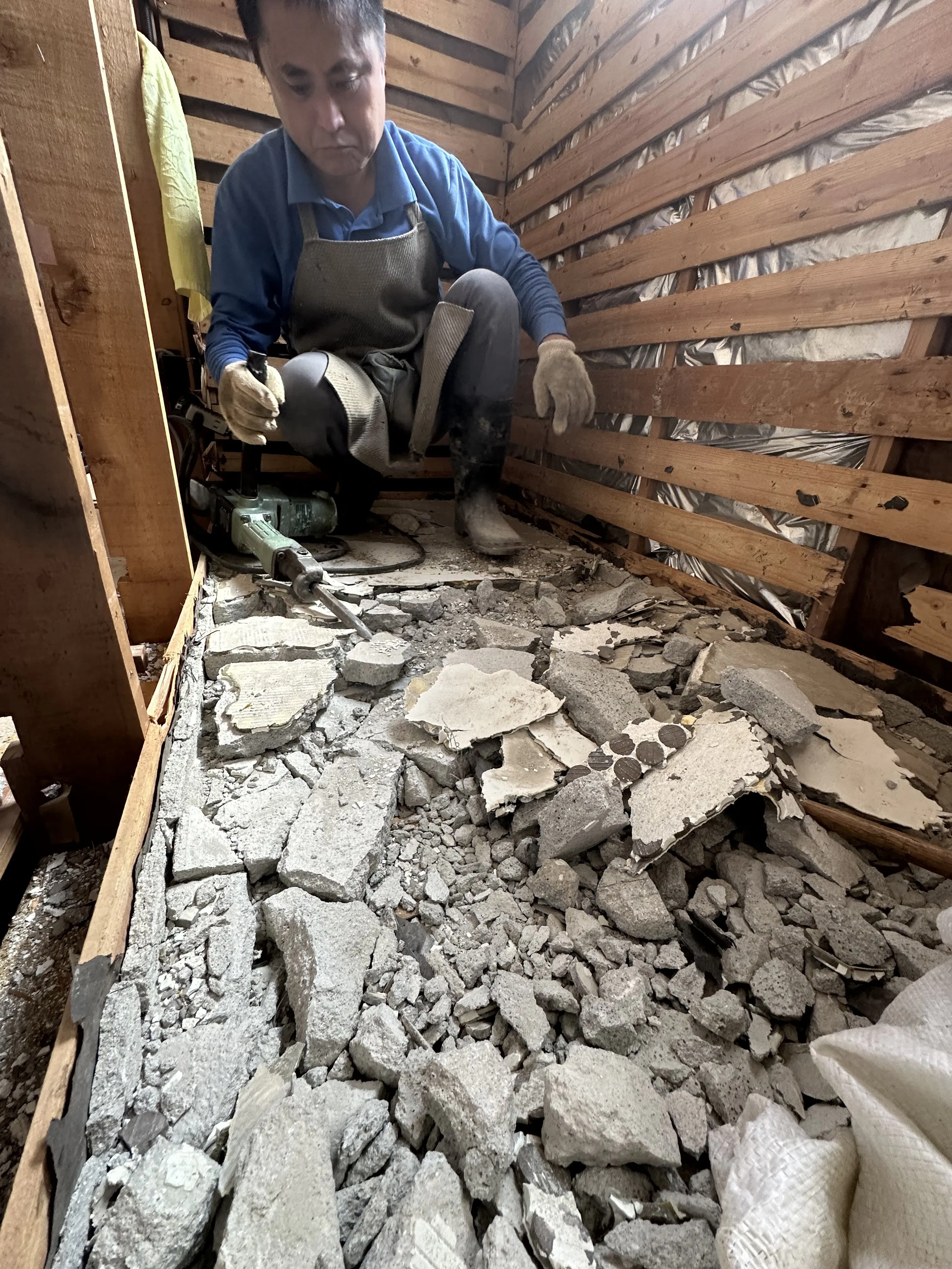 なぜか古い家のトイレはコンクリートで覆われてる。水もれしないようにしたいのか。これを壊すのにドリルやハンマーを使ってますが硬くて難儀します。1つのトイレに土嚢袋15個分のコンクリート。