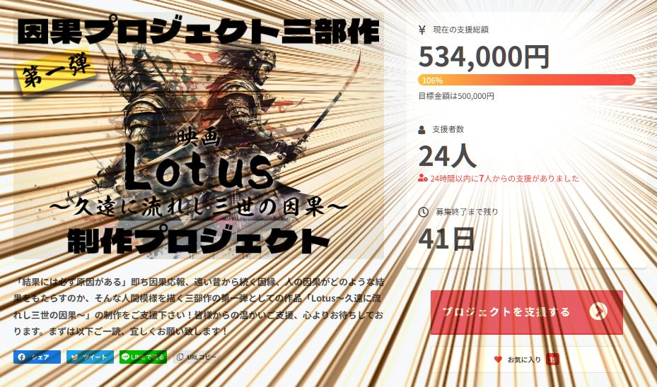 みなさまこんにちは!Lotus 監督の高山です!関係者の皆様からのご支援から始まり、開始早々から盛り上げて頂いております当プロジェクトですがなんと、なんと、なんと...開始2日目にして、ファーストゴールの「50万円」を達成いたしました!!昨日、終日ラジオ関係の業務の為、中々活動報告の投稿などに手をかけることが出来なかったのですが、業務中も「支援が入りました!」の通知が沢山届き驚くと共にキャスト様方の「こちらで宣伝しました!」などの報告も大量に届き、スマホの通知が鳴りやみませんでした本当にありがとうございます。本来であれば監督の僕が一番広報やらなんやらと走り回るのが筋かと思うのですが...こんな時、心から「良いチーム、良きメンバー」にご縁を頂き我々の元に集ってくださったことに感謝してもしきれません(´;ω;`)この勢いを止めないように、ネクスト、セカンドゴールの「100万円」を目指します!まだまだ盛り上げるように、TikTokやYouTubeなどを活用しもっともっと作品に興味を持って頂けるように色々と計画中です!引き続き「Lotus~久遠に流れし三世の因果~」にご注目下さい!本当にありがとうございます、引き続きご支援、応援、宜しくお願いします!