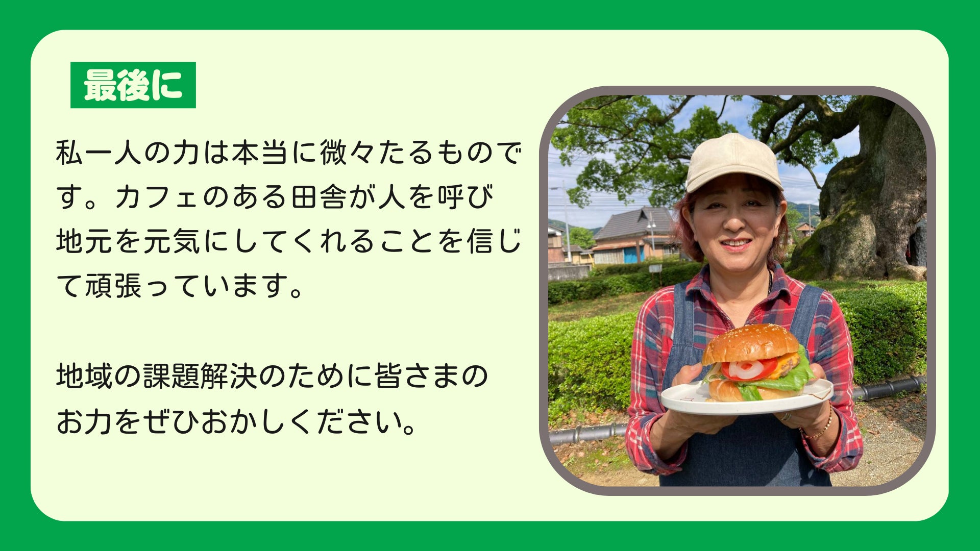 私一人の力は本当に微々たるものでしかありません。カフェのある田舎が、人を呼び地元を元気にしてくれると信じて、頑張っていきたいと思っています。どうぞ応援よろしくお願いいたします。