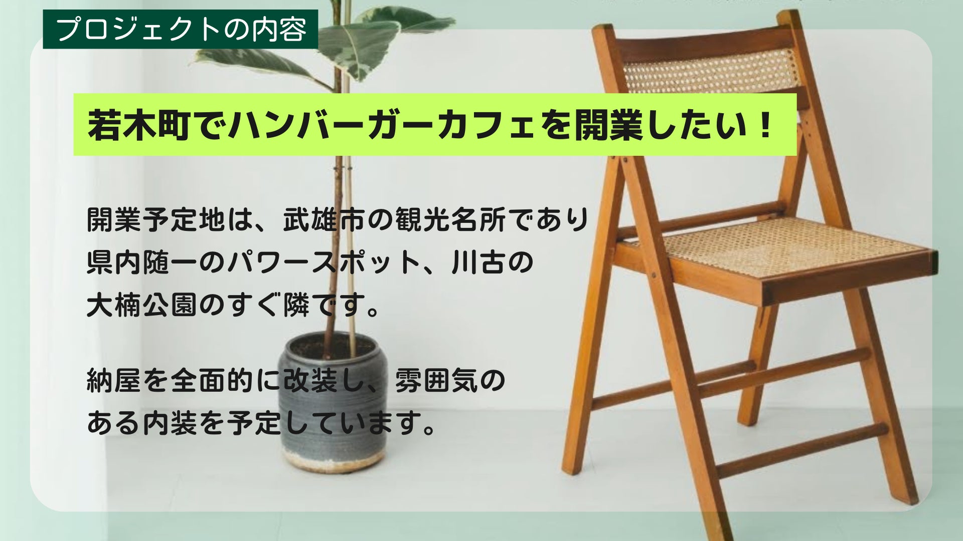 年々過疎化が進むこの佐賀県武雄市若木町川古、この場所で地域を元気にするためにハンバーガーカフェを開業したい。
