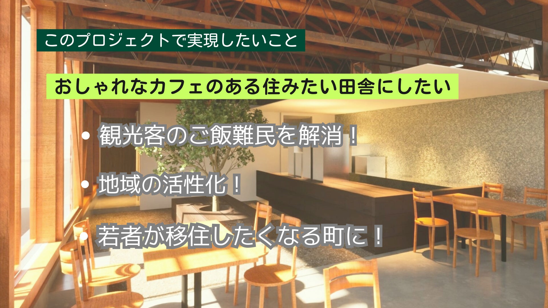 一からカフェを作るという大変な計画ですが、プロジェクトはすでに半年前から始動しており、プロの飲食店プロデューサー、一級建築士事務所とチームを組み着々と計画は進んでおります。SDGS(持続可能な開発目標)に配慮した飲食店経営も課題として考えており、規格外、余剰野菜なども食材として活用し、廃棄野菜の削減にも取り組みたいと考えています。