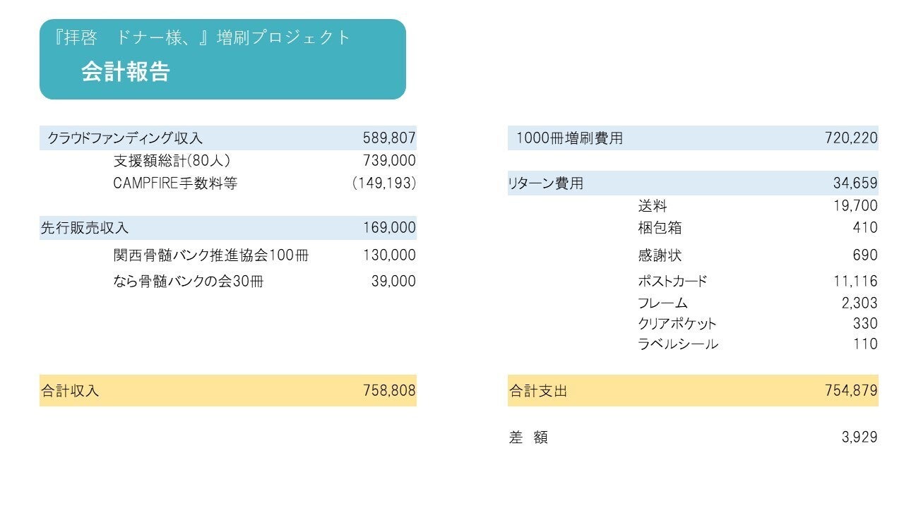 お陰様を持ちまして『拝啓 ドナー様、』増刷プロジェクトが無事完了しましたことをご報告いたします。改めまして心より御礼申し上げます。ありがとうございました。