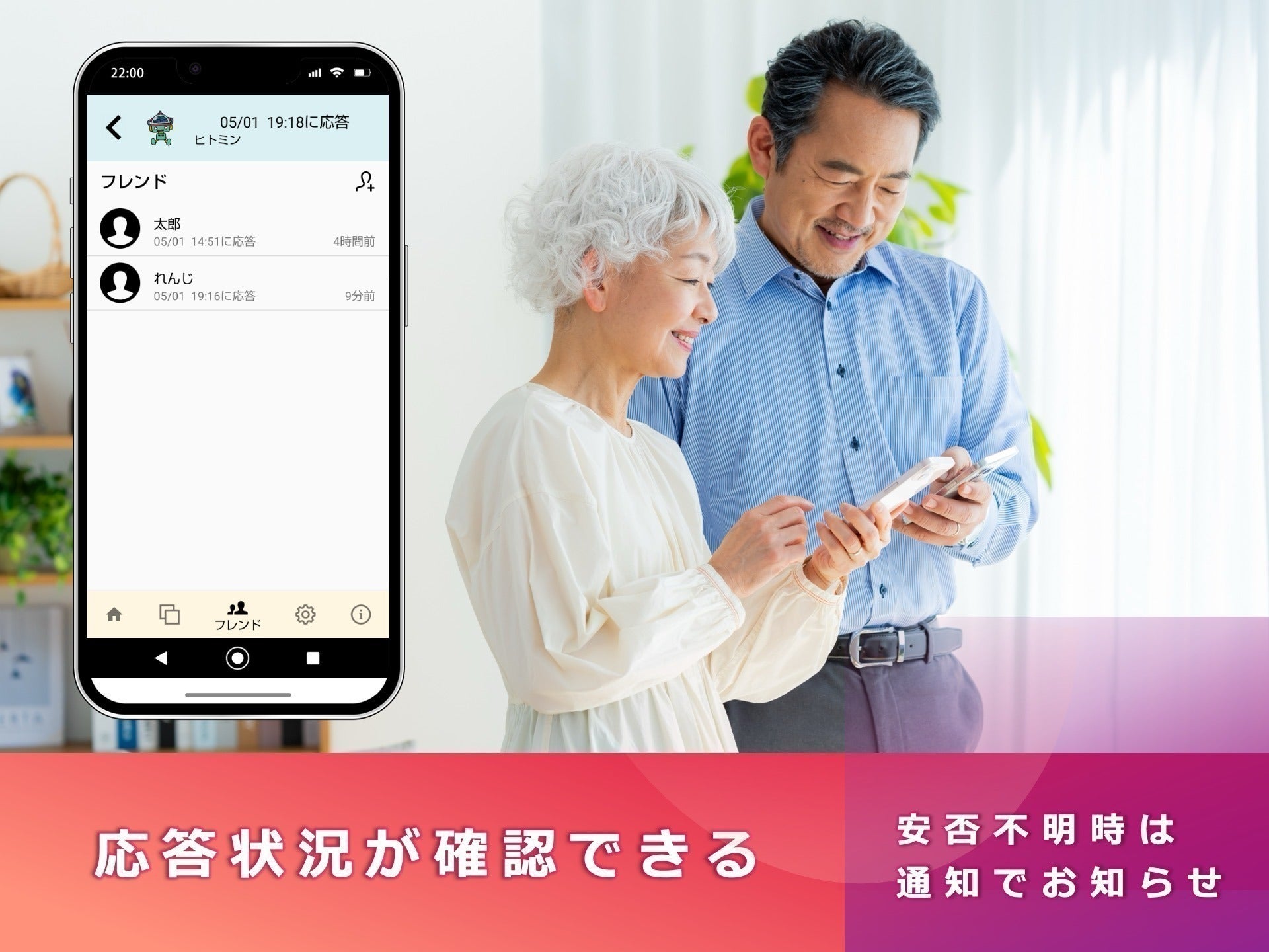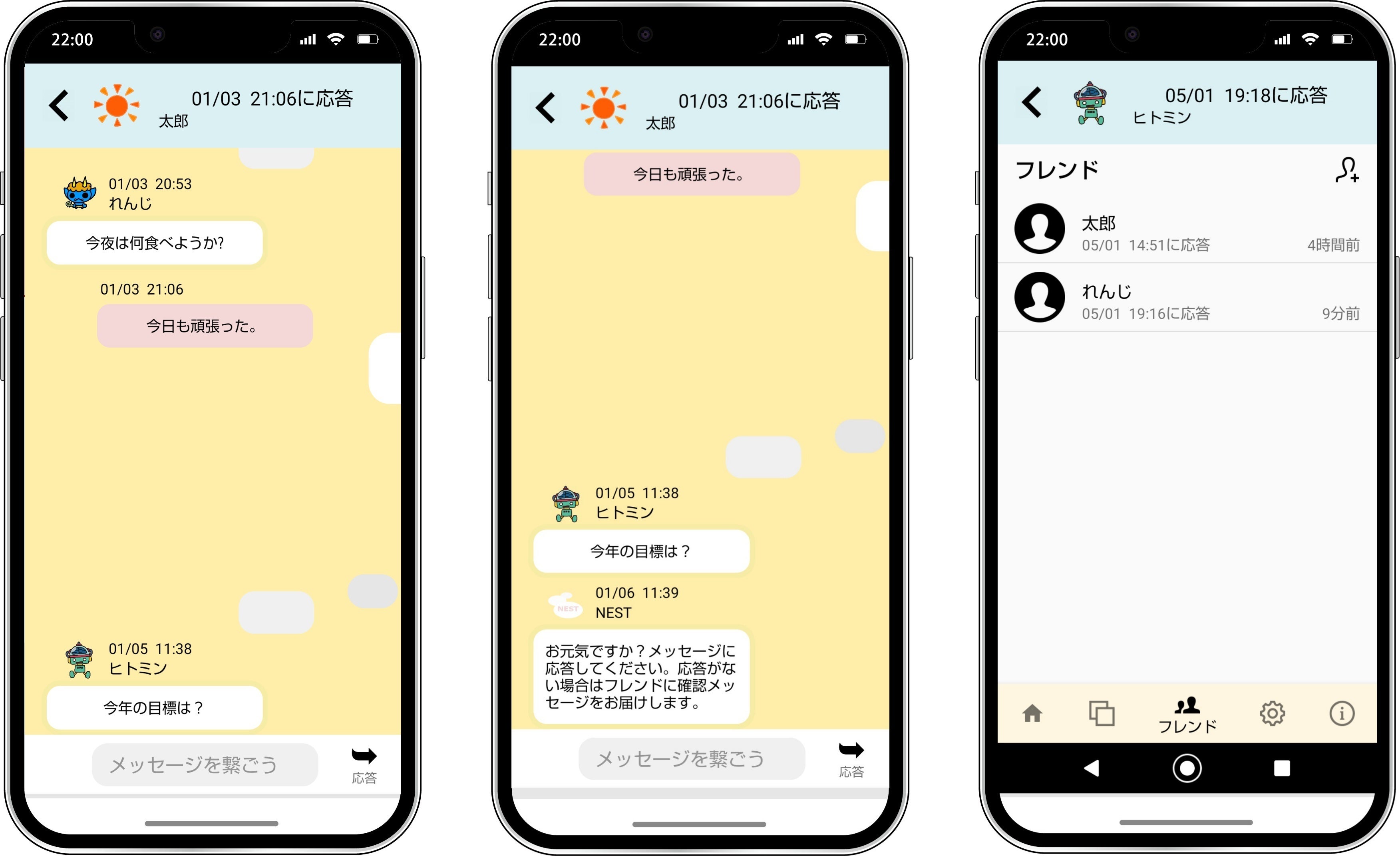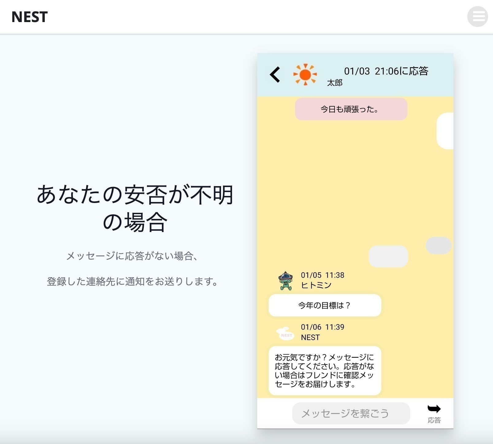 アプリの機能・・・ユーザが定期的に届くメッセージに応答することで安否確認をします。