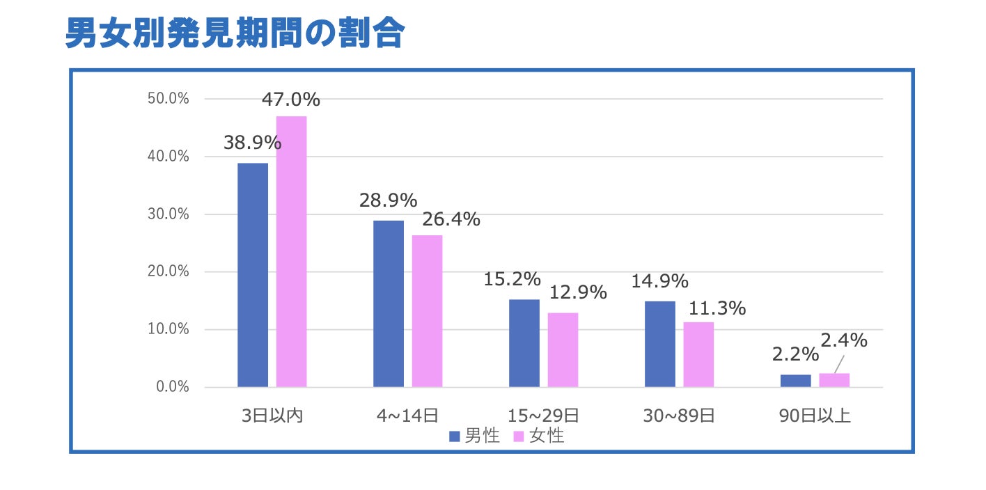 孤独死発生から発見までの平均日数は18日。3日以内の発見に着目すると、女性の場合は47%と、男性より早期に発見される割合が高いことが判る。また、男性は、15日以上経過して発見される割合は3割を超えており、長期化する傾向がみられる。