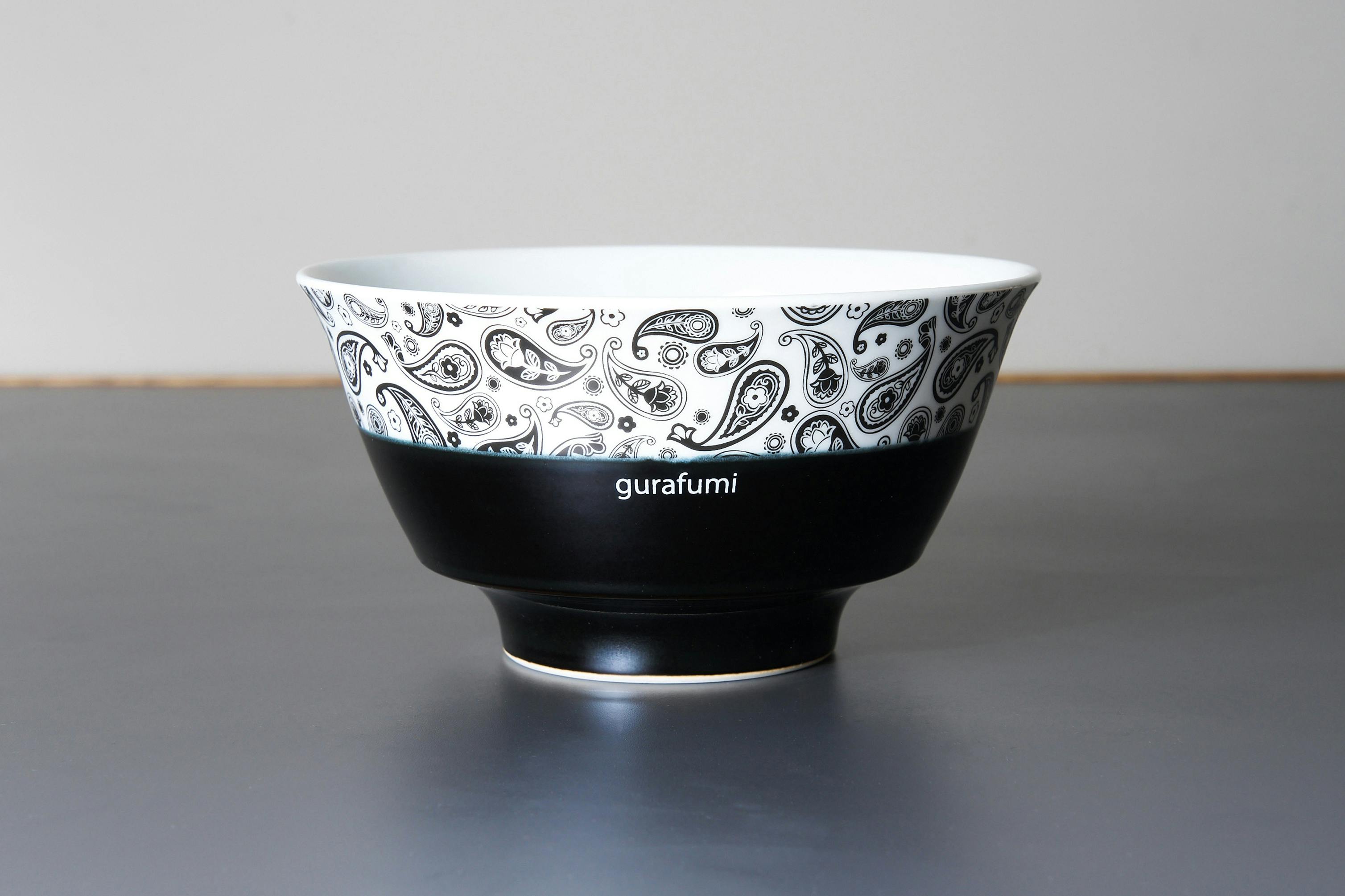 今回の大きな目玉は2個です。1つは当店のオリジナルデザインの有田焼です。これは佐野実さんが創業された会社で作られた物でラーメンをおいしく保温しまた綺麗に見える様に特別に設計されています。この有田焼の丼に当店オリジナルのペイズリー柄のデザインを焼き入れしてもらってあります。自宅のらぁ麺を簡単に底上げしてくれます。