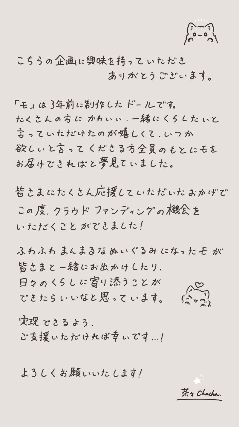 皆様のご支援のおかげで「モ」ぬいぐるみプロジェクトが達成率100%を超え、ぬいぐるみとリターン品を制作・お届けできることとなりました!皆様には大変多くのあたたかいメッセージと、ご支援頂きまして改めて厚くお礼申し上げます。