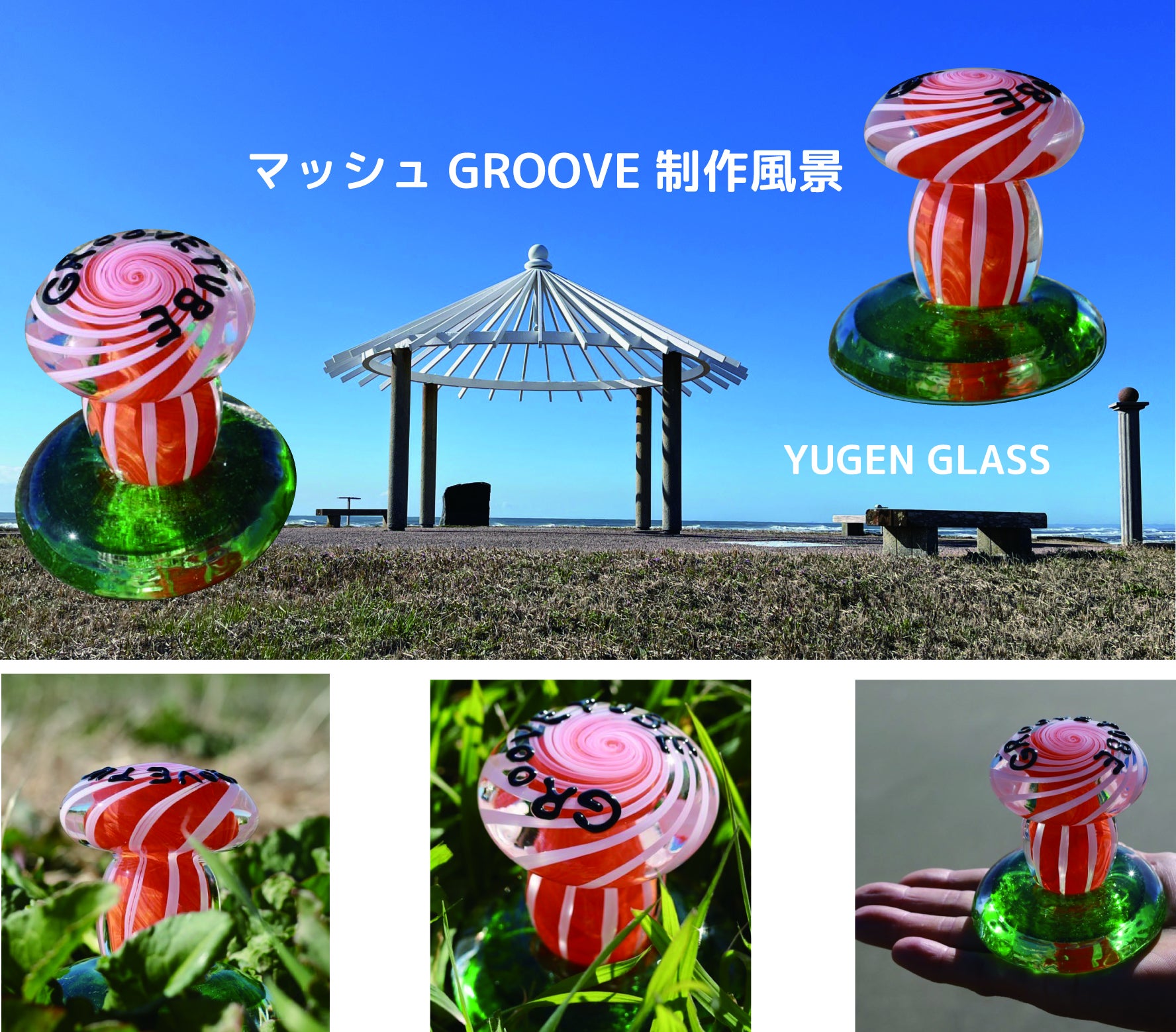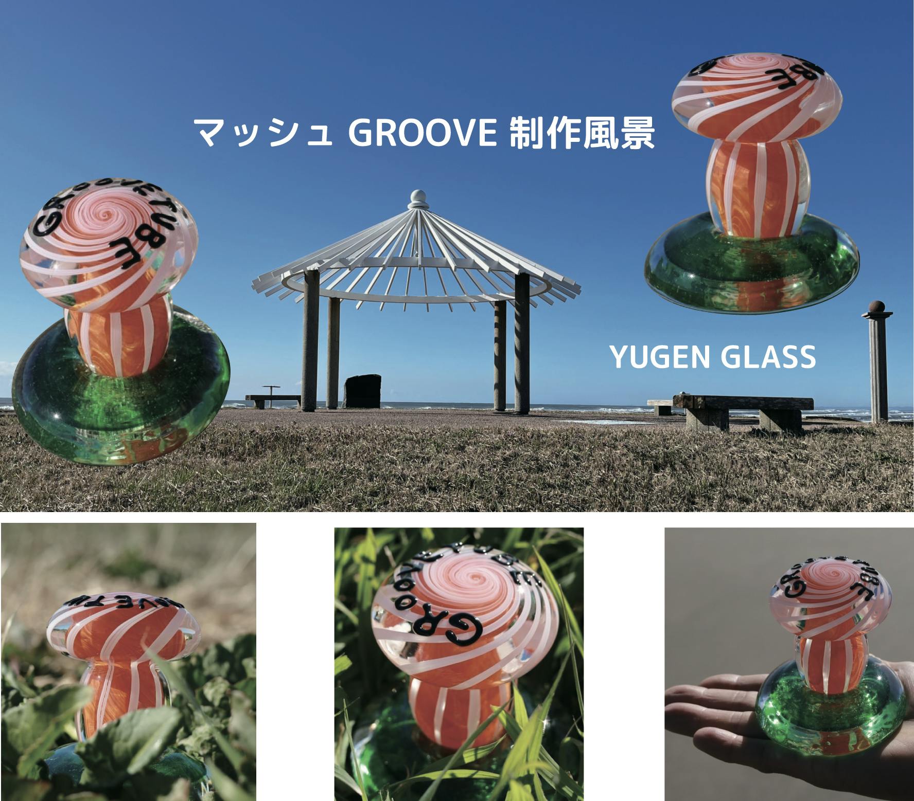 2024/04/02 18:57今回クラファンへ向けてキノコのガラスオブジェを制作していただいた、横芝光町のガラス作家YUGEN GLASSさんから誕生秘話、制作過程のお話をいただきました。こんなに手の込んだ作品を制作していただきありがとうございます。http://yugen-glass.com/以下YUGEN GLASSさんよりメッセージ「マッシュGROOVE de 屋形海岸」と名付けられたガラスのマッシュルームは、屋形海岸の小高い丘にある東家から発想しました。思えばGROOVETUBE FESのステージに飾られている植田工さんのアート作品にもマッシュルームが描かれており、屋形海岸の楽しいフェスのイメージからガラスマッシュルームになったのも自然な流れだったような気がします。ガラスを草むらやビーチで撮影してくれたのは高3娘( @fukumi.1227 )。小4息子はその横で犬散歩。屋形海岸はYUGEN GLASS家族にとって身近な存在で子供たちの成長には最高の遊び場所です。そんな特別な場所で開催されるGROOVETUBE FESは毎年の大きな楽しみになっています!★制作工程1、マッシュルームの内側となる一層目に色ガラスをつける。2、鉄竿の回転速度を調整しつつ重力を利用して、柔らかいガラスをマーブル状に練り込む。3、マーブル状に練り込んだガラス。4、あらかじめ細く引いておいた白色ガラス棒を立て、柔らかいガラス(二層目)につける。5、あらかじめ白色ガラス棒を引いているところ(前日)。6、つけたガラス棒を整えて先端を絞る。7、 ねじってグルーヴ感を出す。8、マッシュルームの形に仕上げていく。9、上から見たところ。10、細く引いたガラス棒を酸素トーチで炙りながらゆっくり文字を描いていく。11、だいぶマッシュGROOVE感が出てきました!12、丘をイメージしたグリーンのガラスタネをつける。13、作品全体の温度を合わせて(フラッシュする)完成。 もっと見る